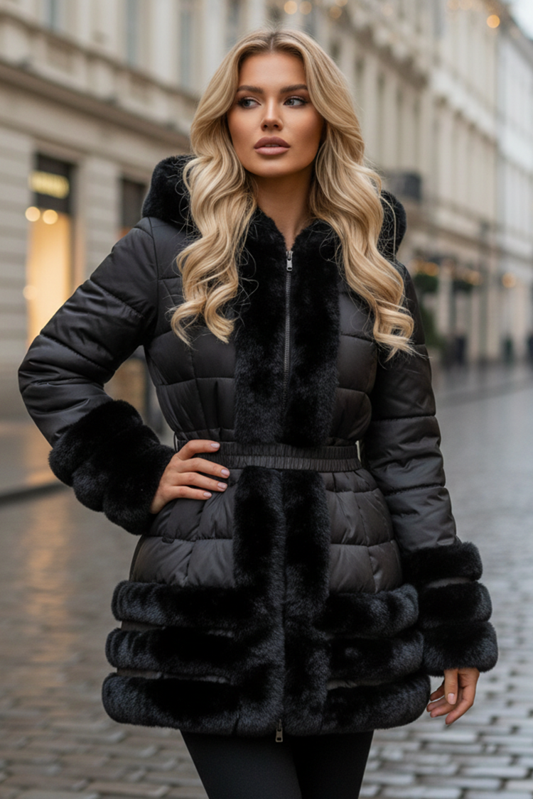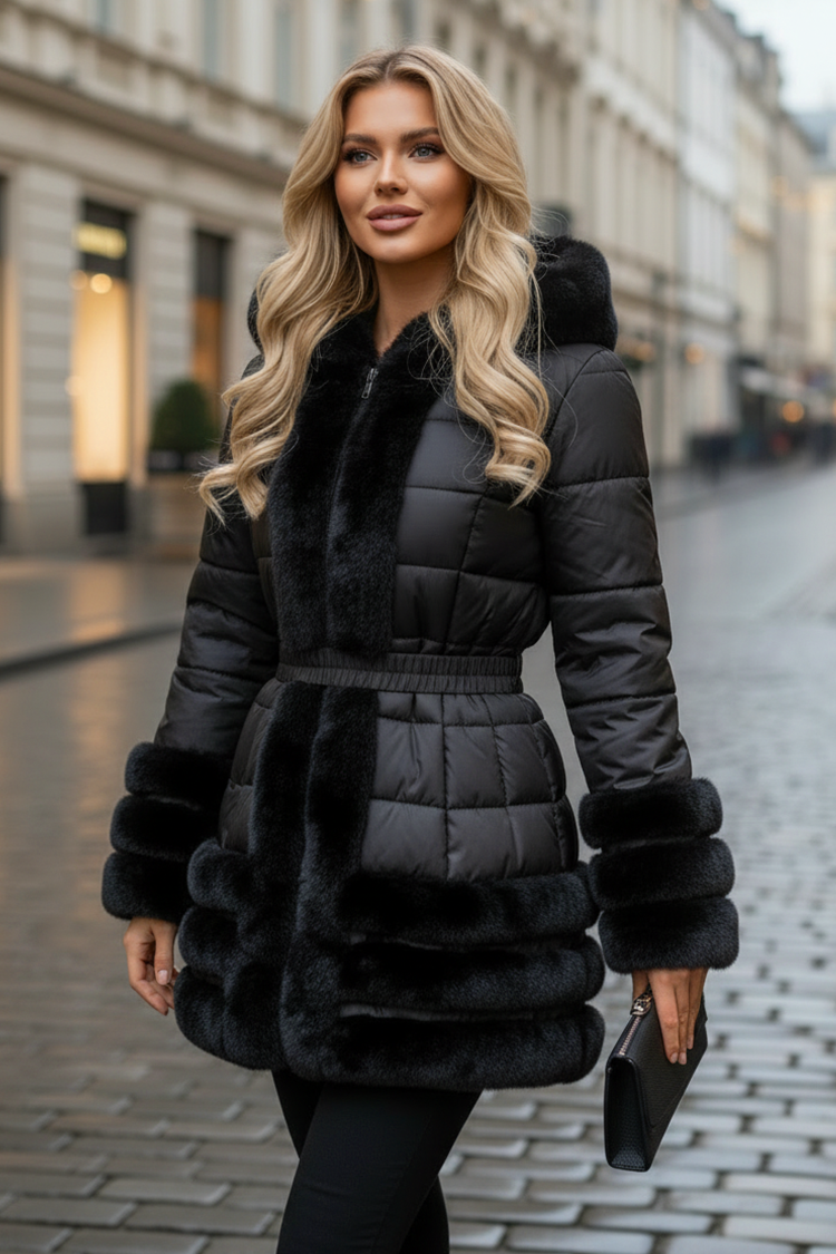 • Моделът е с удобна кройка, закопчаване чрез цип, колан, обемна качулка и ефектни пухени детайли и маншети.