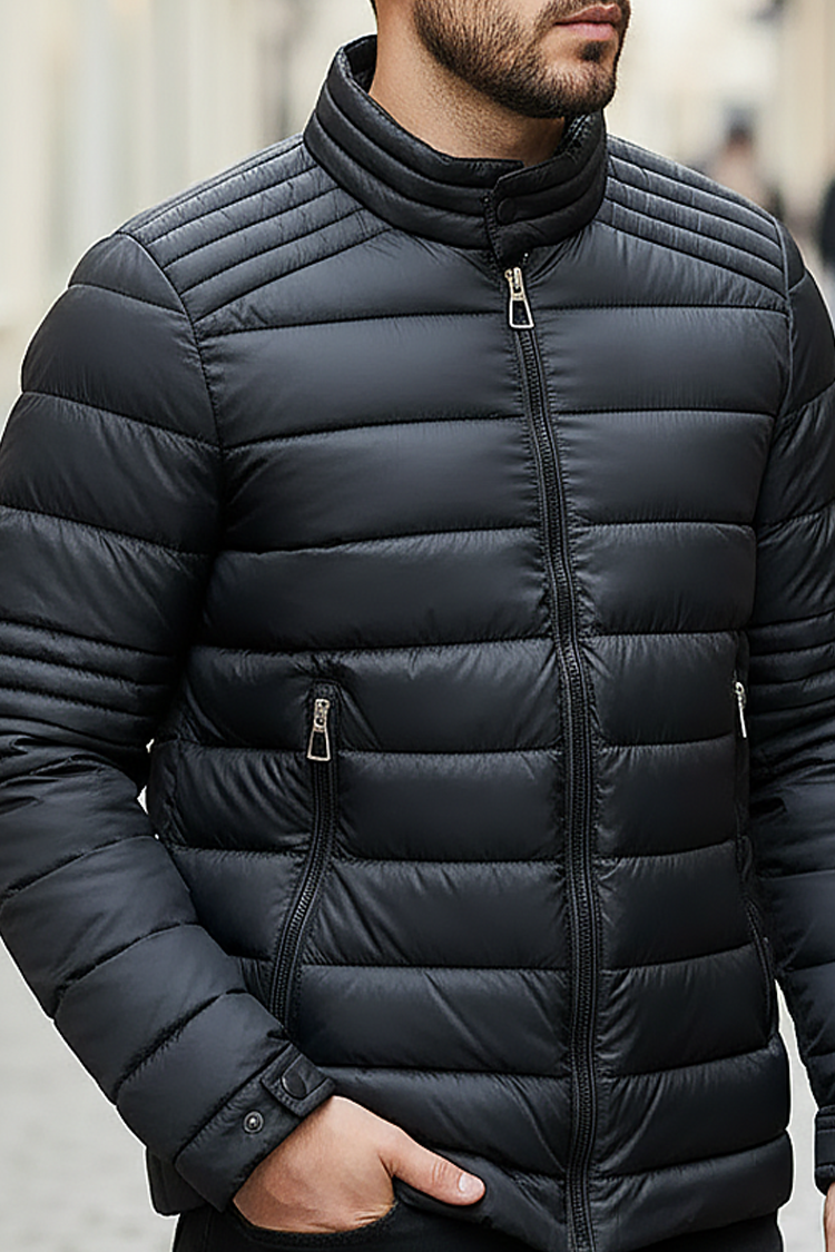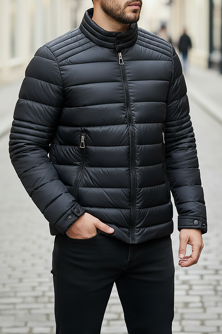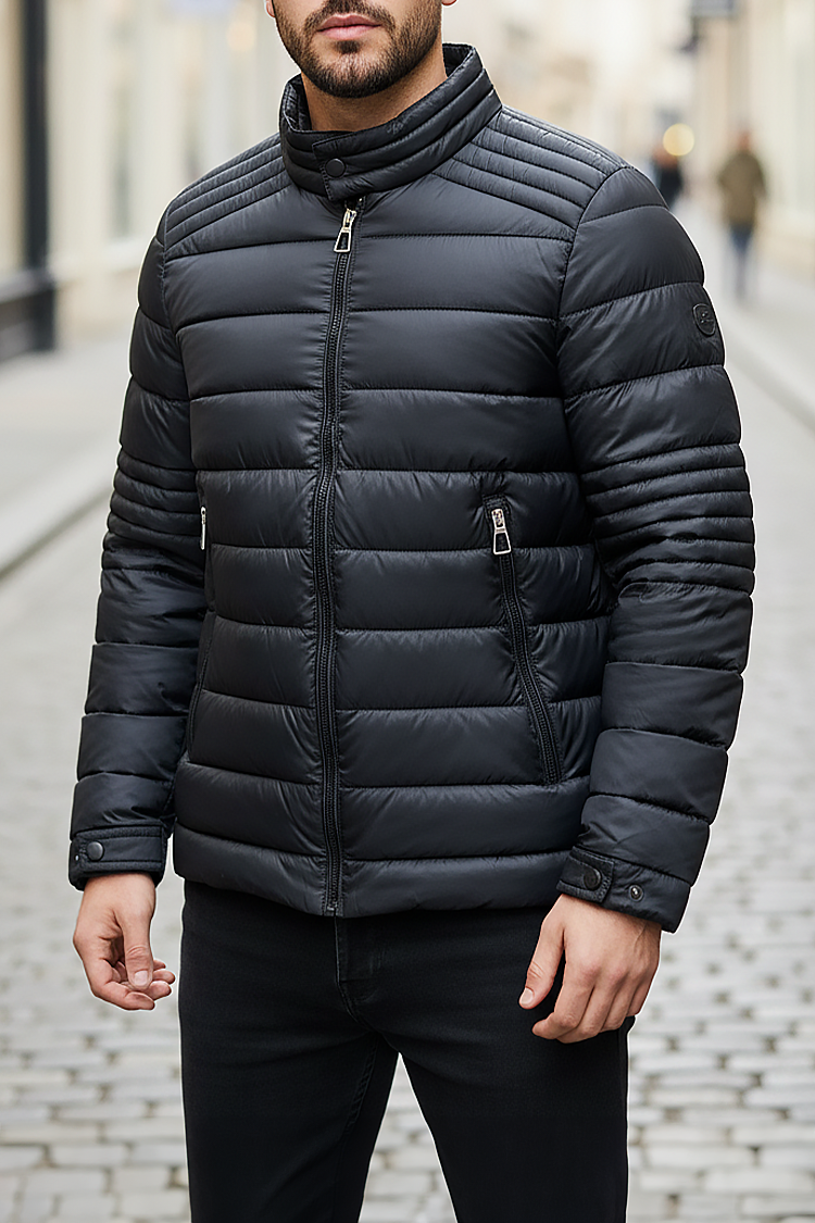 • Удобно мъжко яке с капитониран дизайн и полуполо яка с тик так копче в черен цвят със спортно-ежедневен стил.