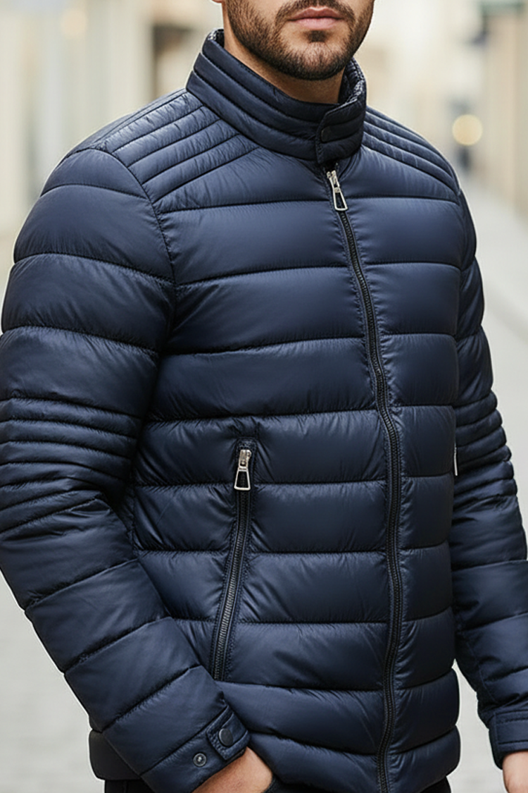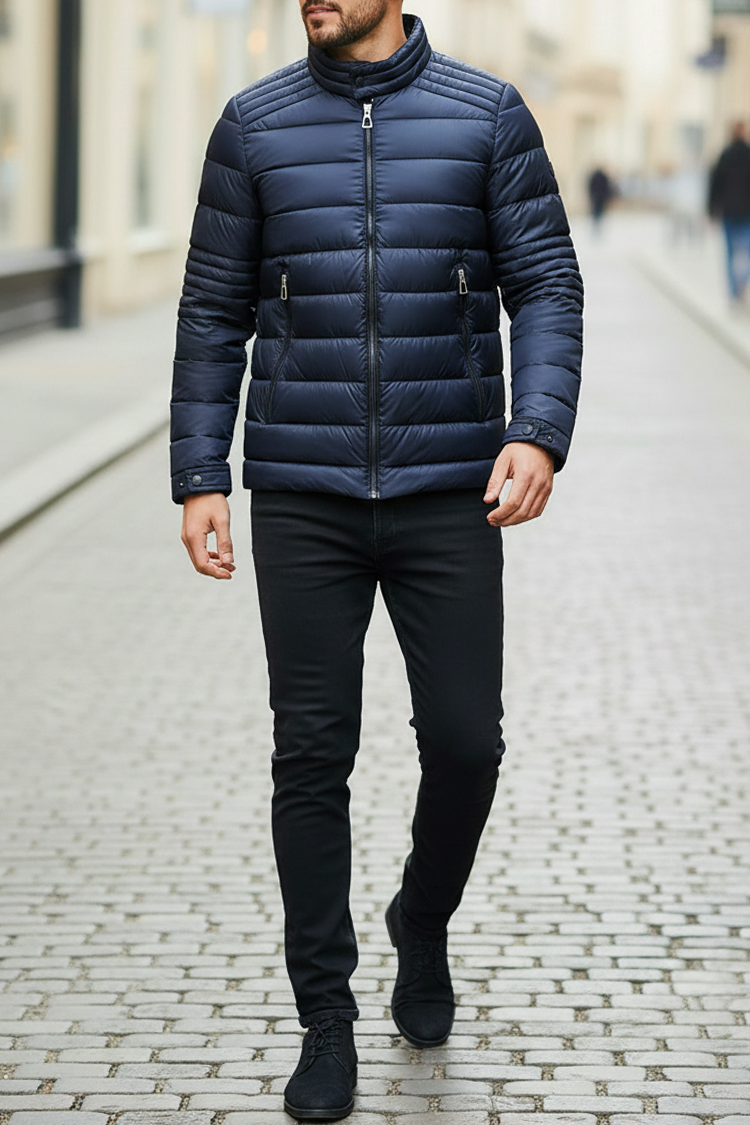 • Удобно мъжко яке с капитониран дизайн и полуполо яка с тик так копче в тъмносин цвят със спортно-ежедневен стил.