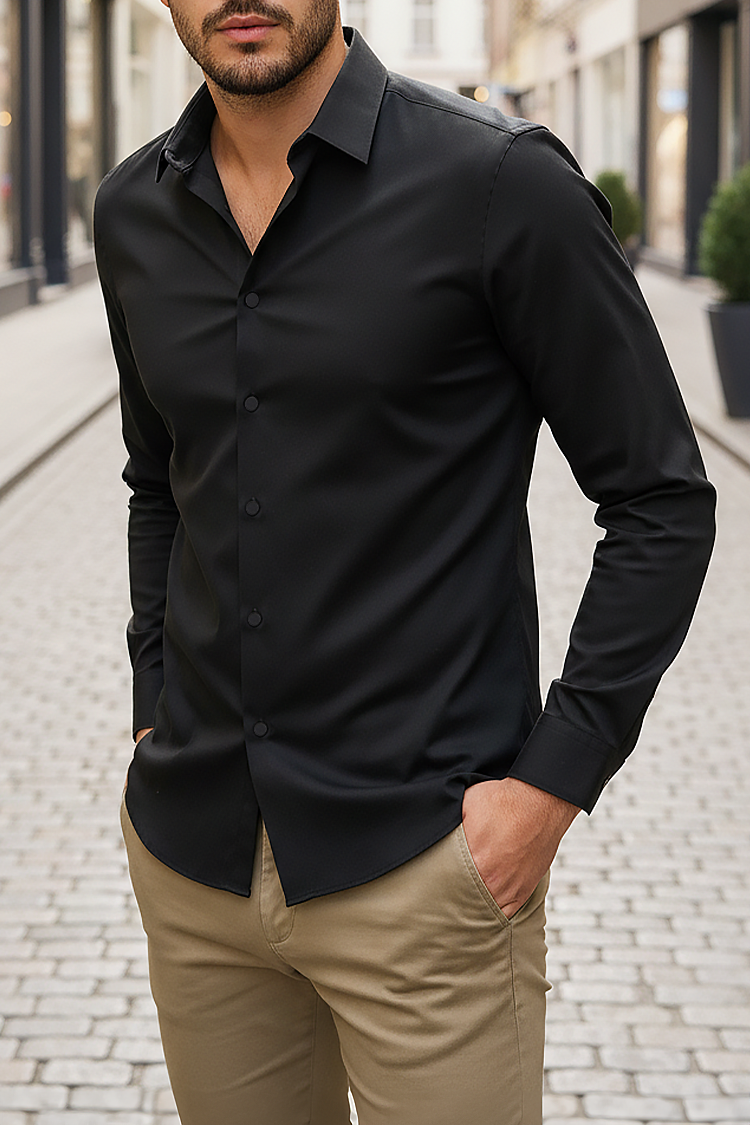• Елегантна мъжка риза с класически дизайн в черен цвят, подходяща за различни модни съчетания.