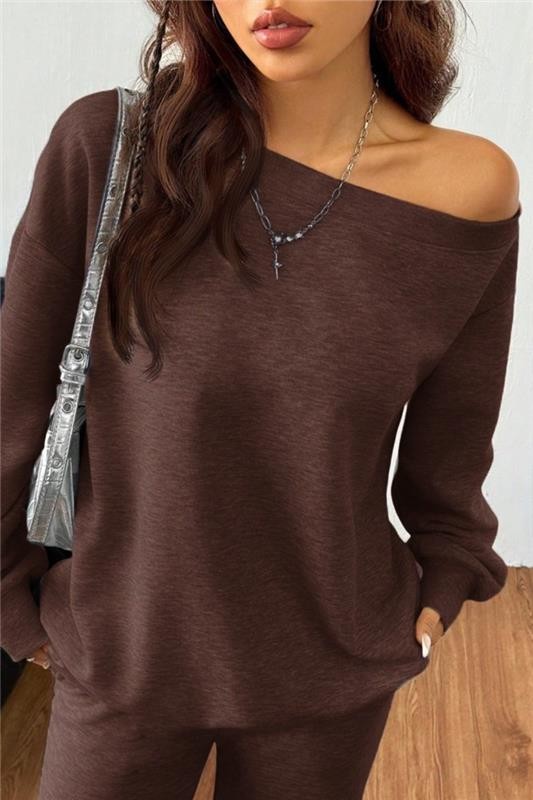 - Блузата е с паднало рамо и свободна кройка, а панталонът - с висока талия и широки крачоли.