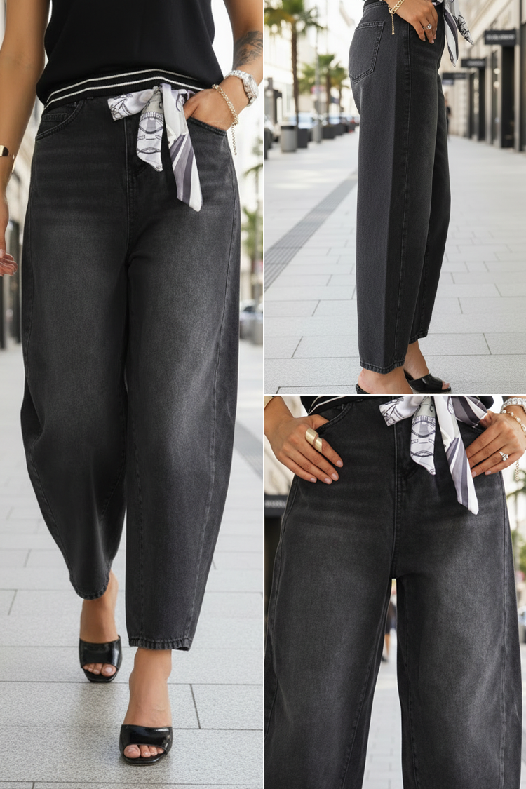 - Моделът е с висока талия, изчистен дизайн и широки крачоли.