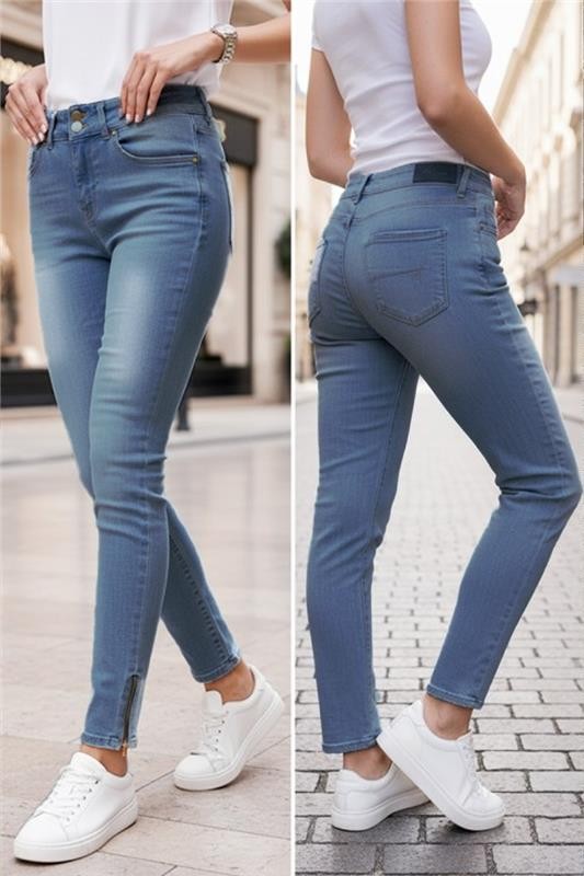 - Разнообразете гардероба си с практичен модел дънки син цвят с избелен ефект и цип в края на крачолите.