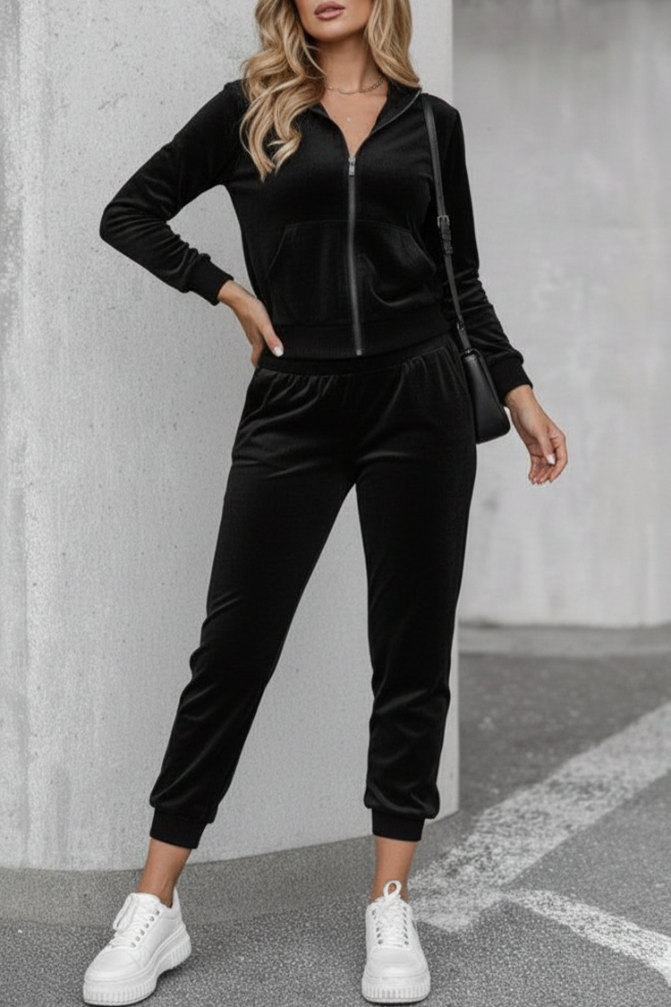 - Суичърът е с цип и качулка, а панталонът - с висока талия и странични джобове.