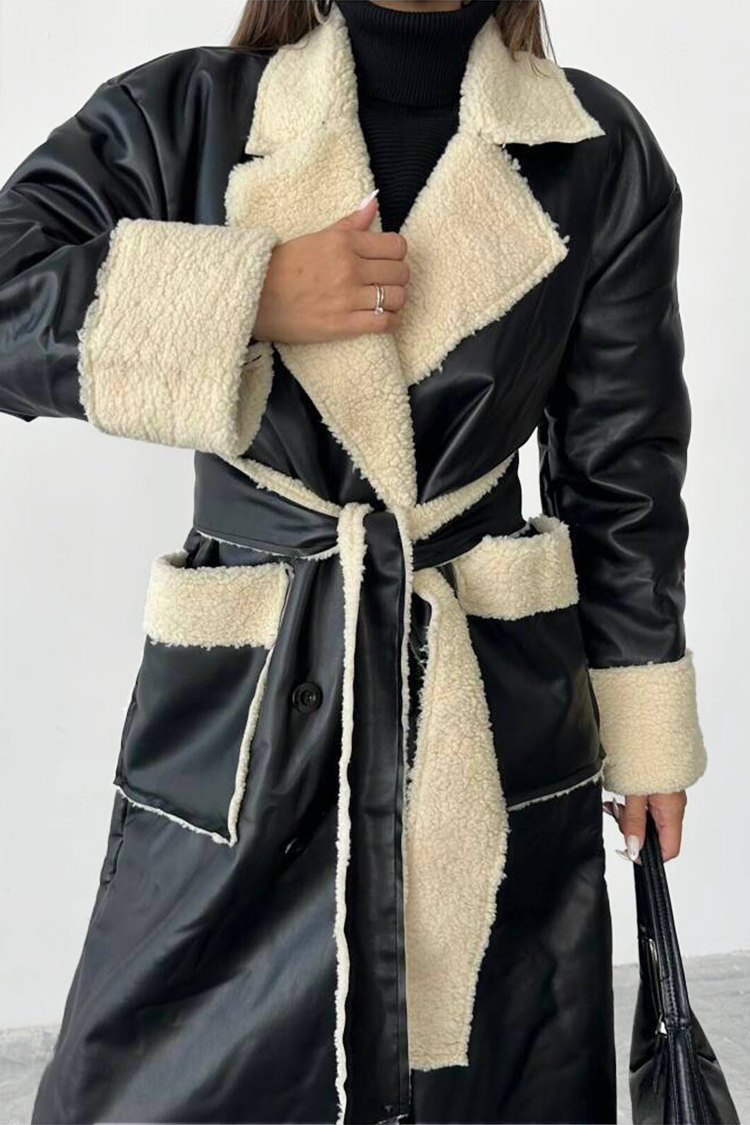 - Моделът е с класическа кройка, елегантна яка, колан, странични джобове и пухени детайли.