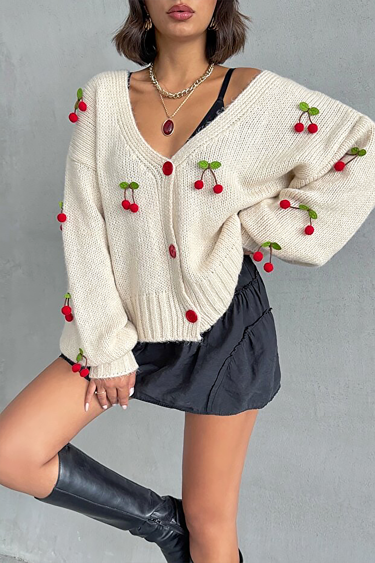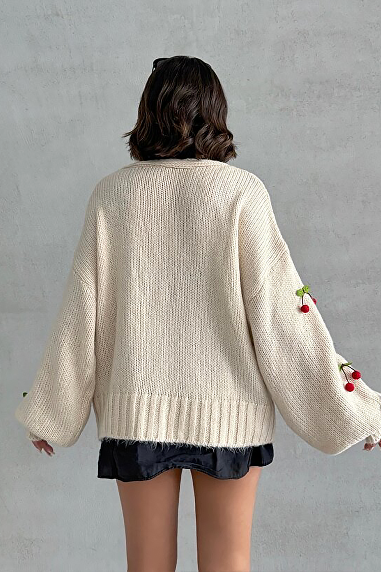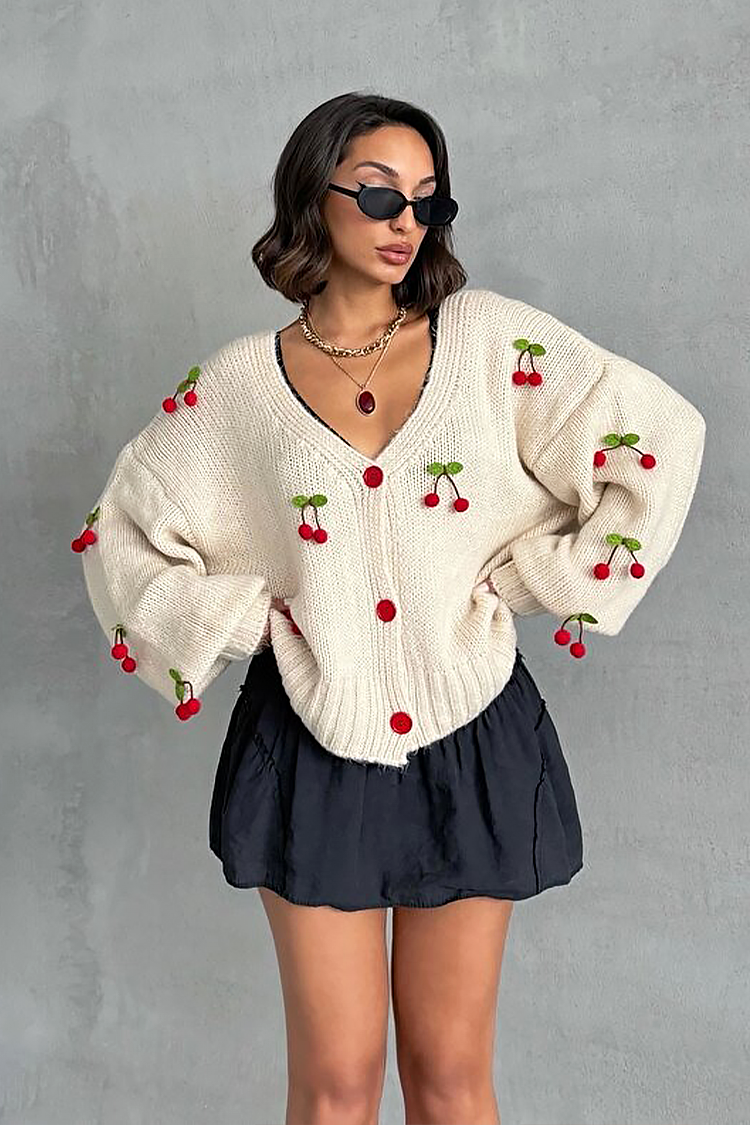 - Моделът е овърсайз кройка, червени копчета, комфортен дизайн и декорация на череши по цялата дължина.