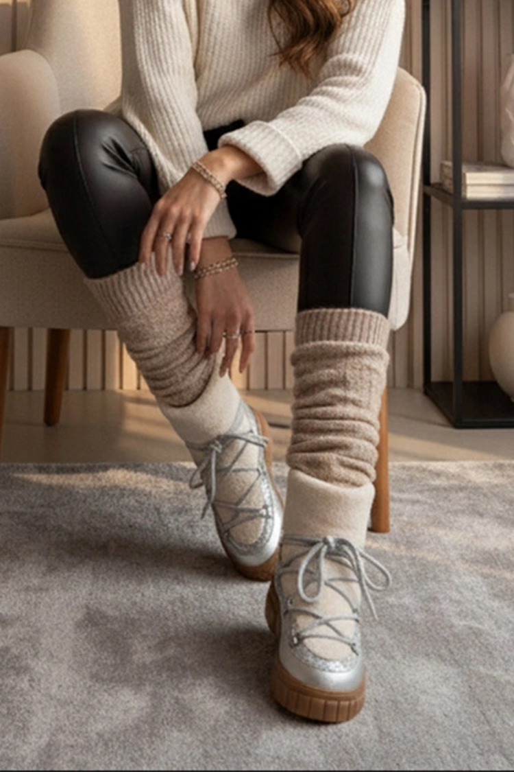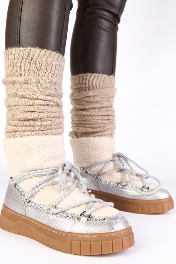 • Топли дамски апрески от непромокаемо материя, декорирани с пухкав еко косъм в сребърен десен.
