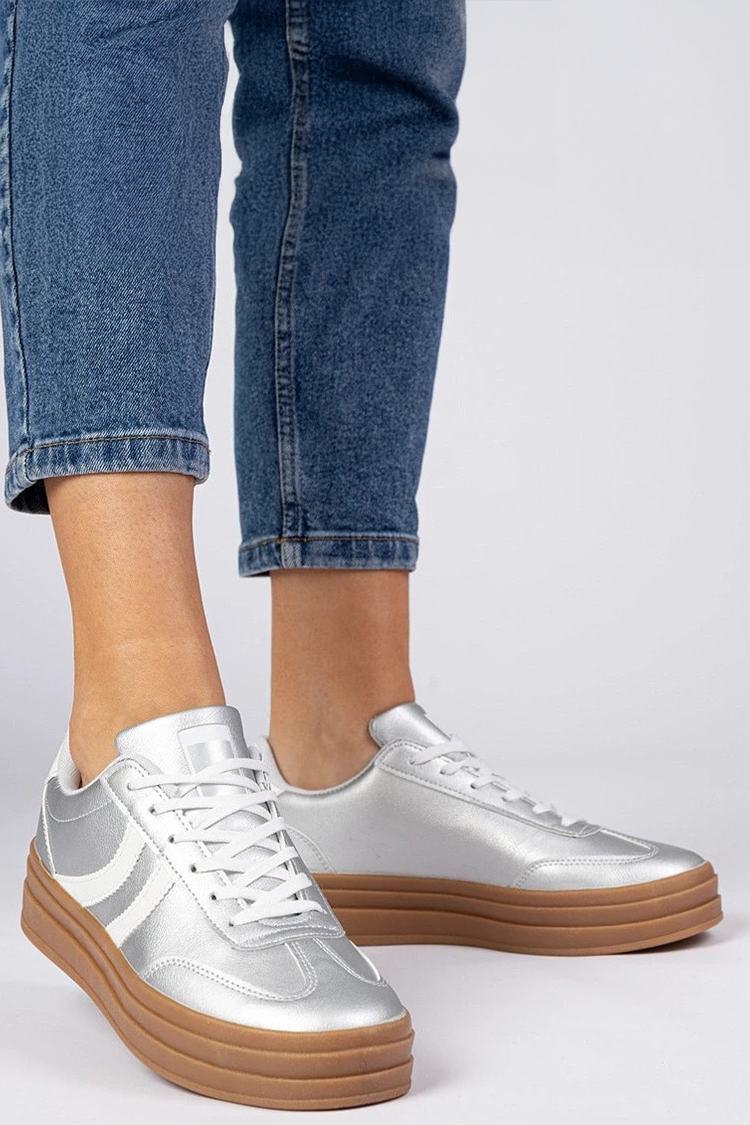 - Дамски кецове от еко кожа в сребърен цвят, с връзки и платформа, подходящи за ежедневието.