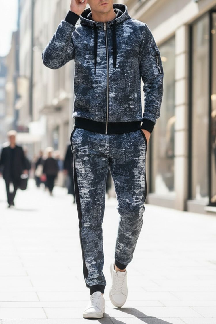 - Удобен мъжки комплект две части с нестандартен десен, състоящ се от суичър и панталон.