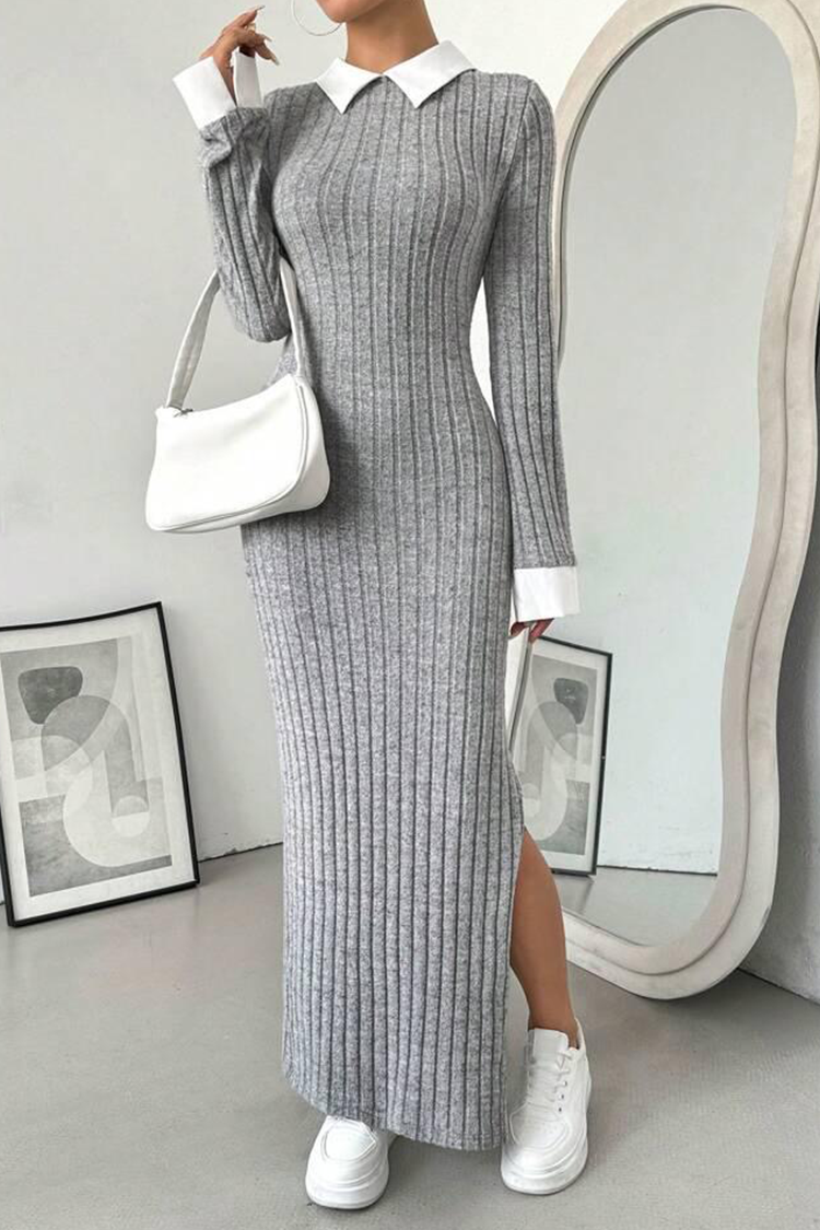 • Моделът е с вталена кройка, дълги ръкави, едноцветен десен, секси цепка и ефектна бяла яка.