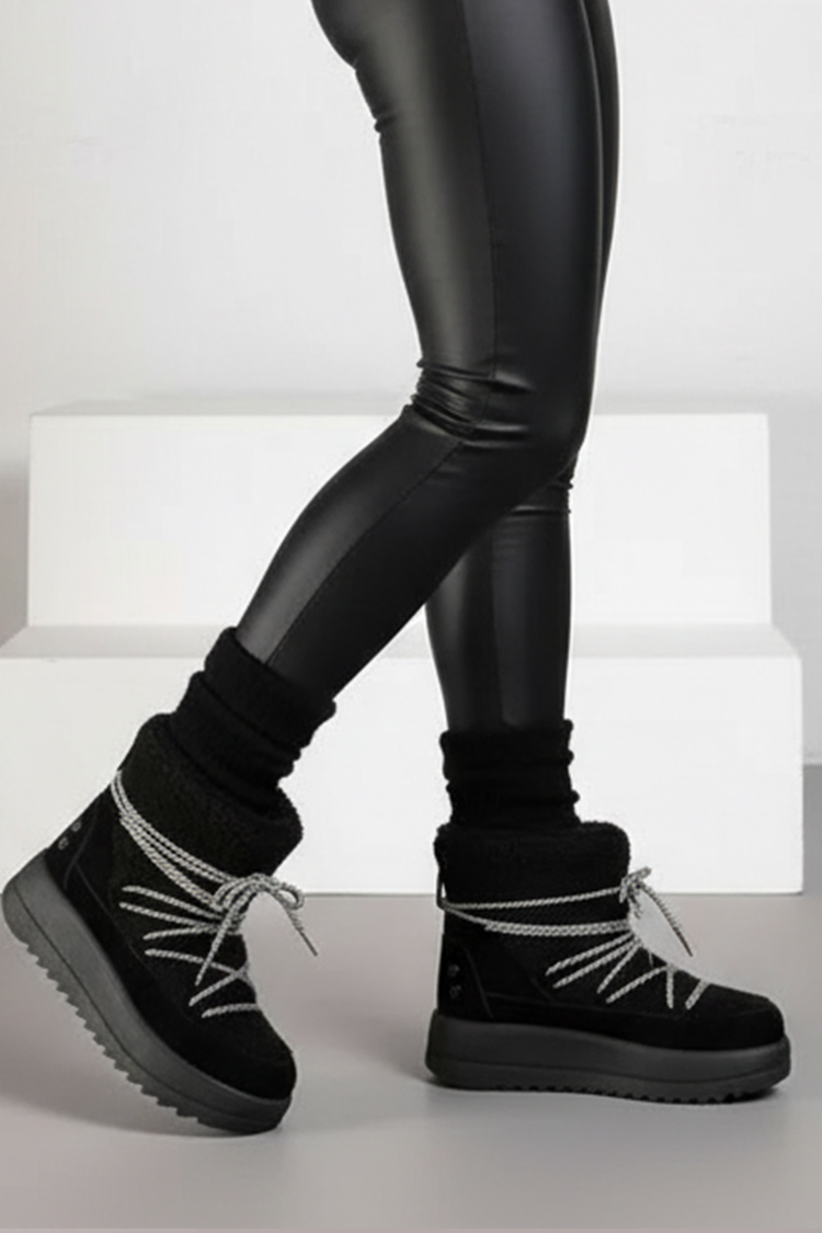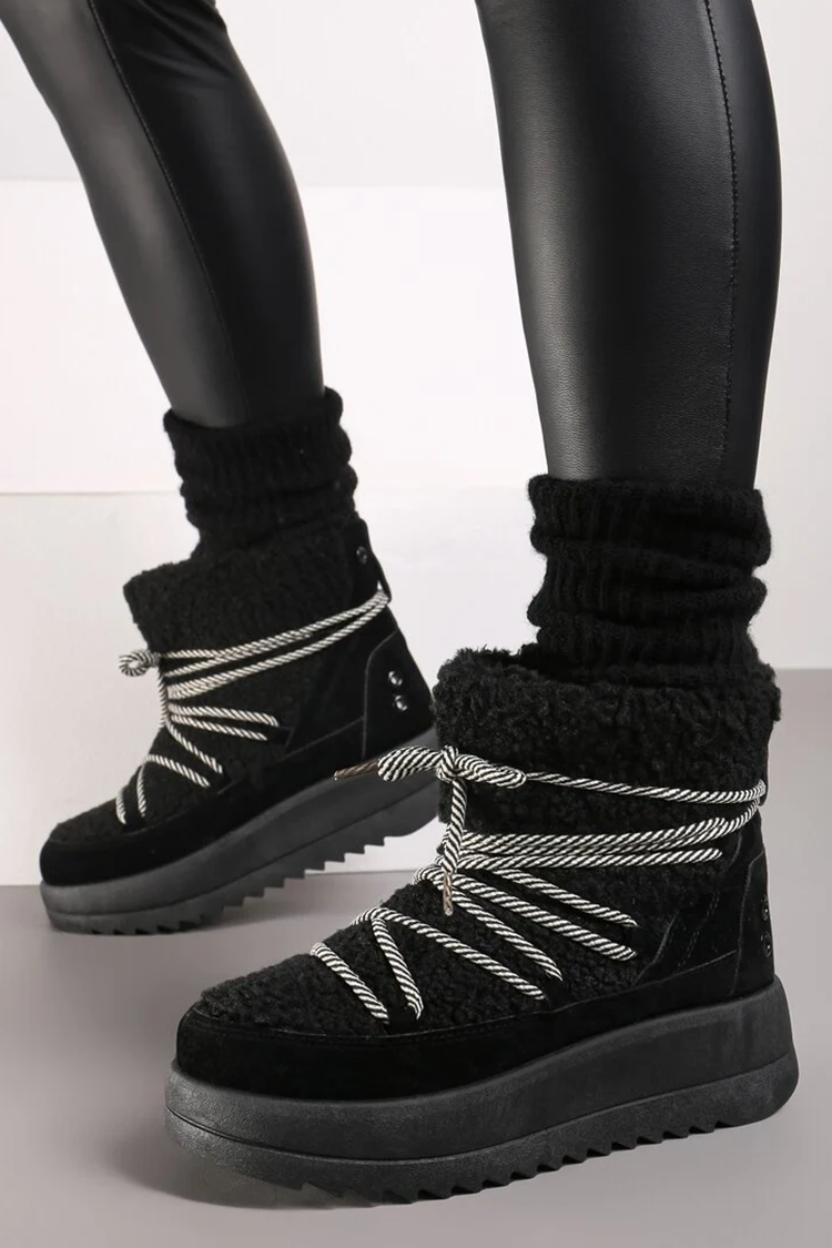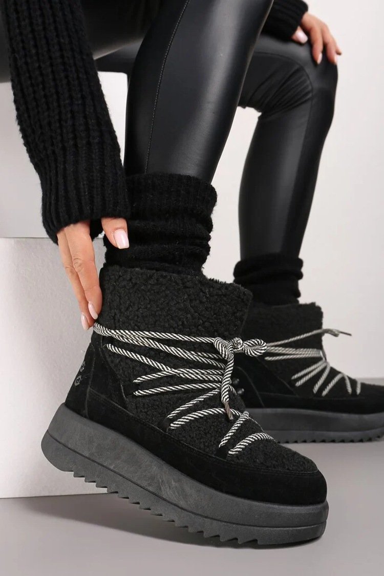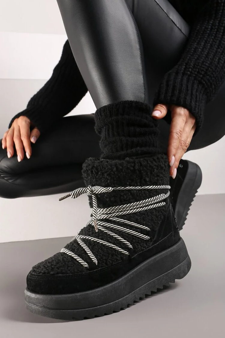 - Топли дамски апрески от непромокаемо материя, декорирани с пухкав еко косъм в черен цвят.