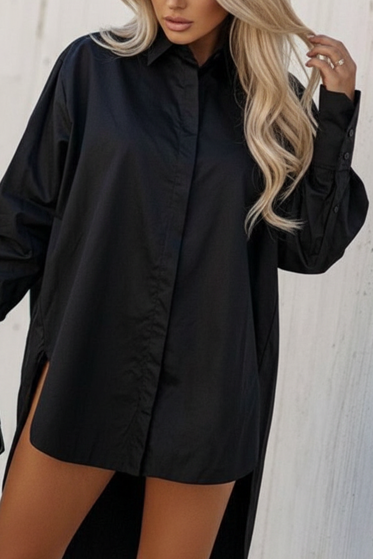 - Моделът е с овърсайз кройка, асиметричен дизайн, черен цвят, копчета и яка.