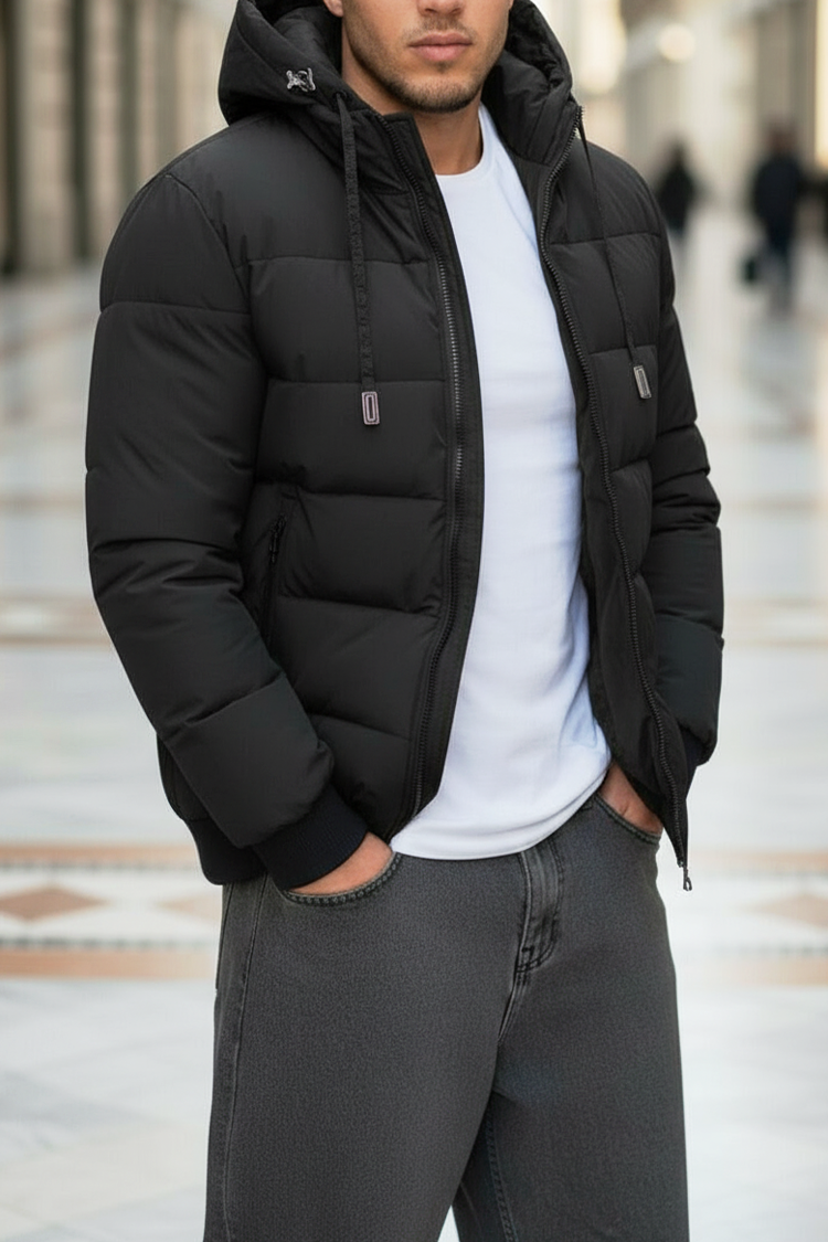 • Мъжко зимно яке с топла подплата, капитониран дизайн и фиксирана качулка в черен цвят.