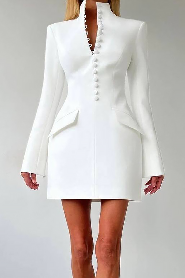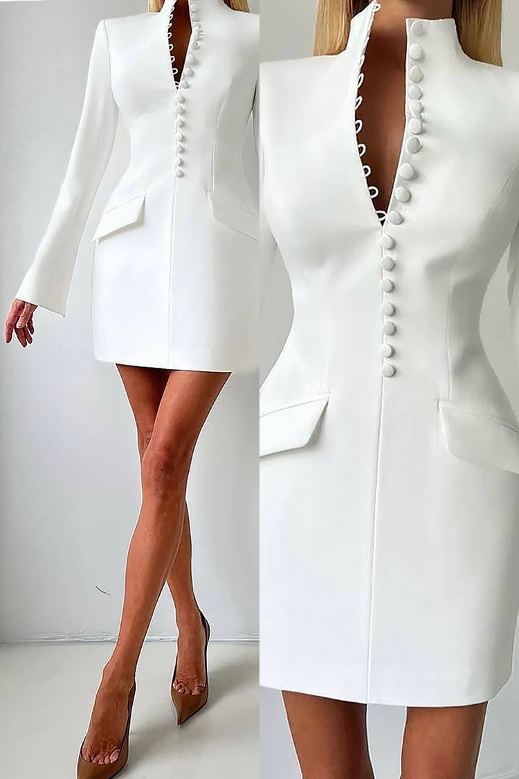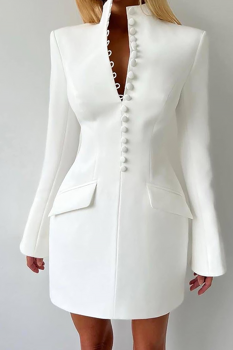 - Роклята е с елегантна кройка тип блейзър, закопчаване с копчета, дълги ръкави и стилни джобове.