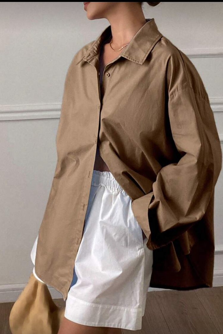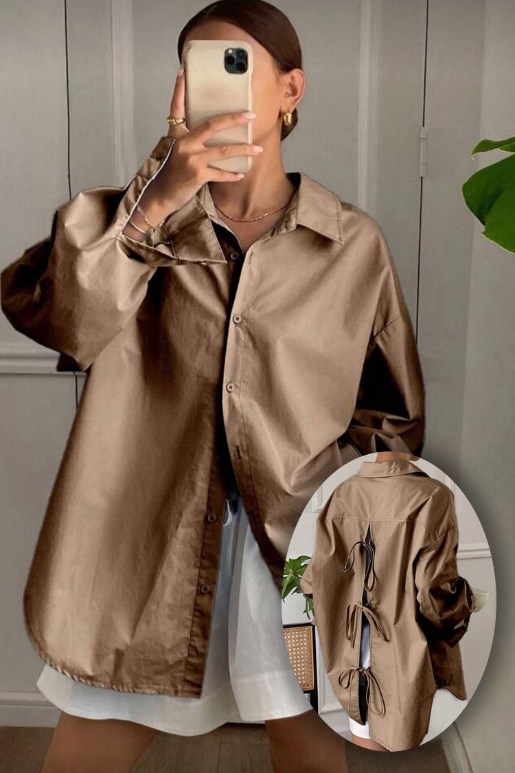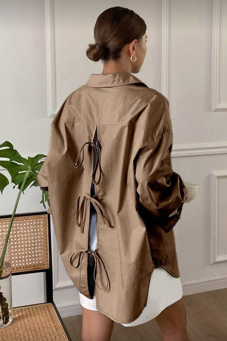 • Моделът е с дълги ръкави, овърсайз кройка, закопчава се чрез копчета отпред и ефектен гръб с декоративни панделки.