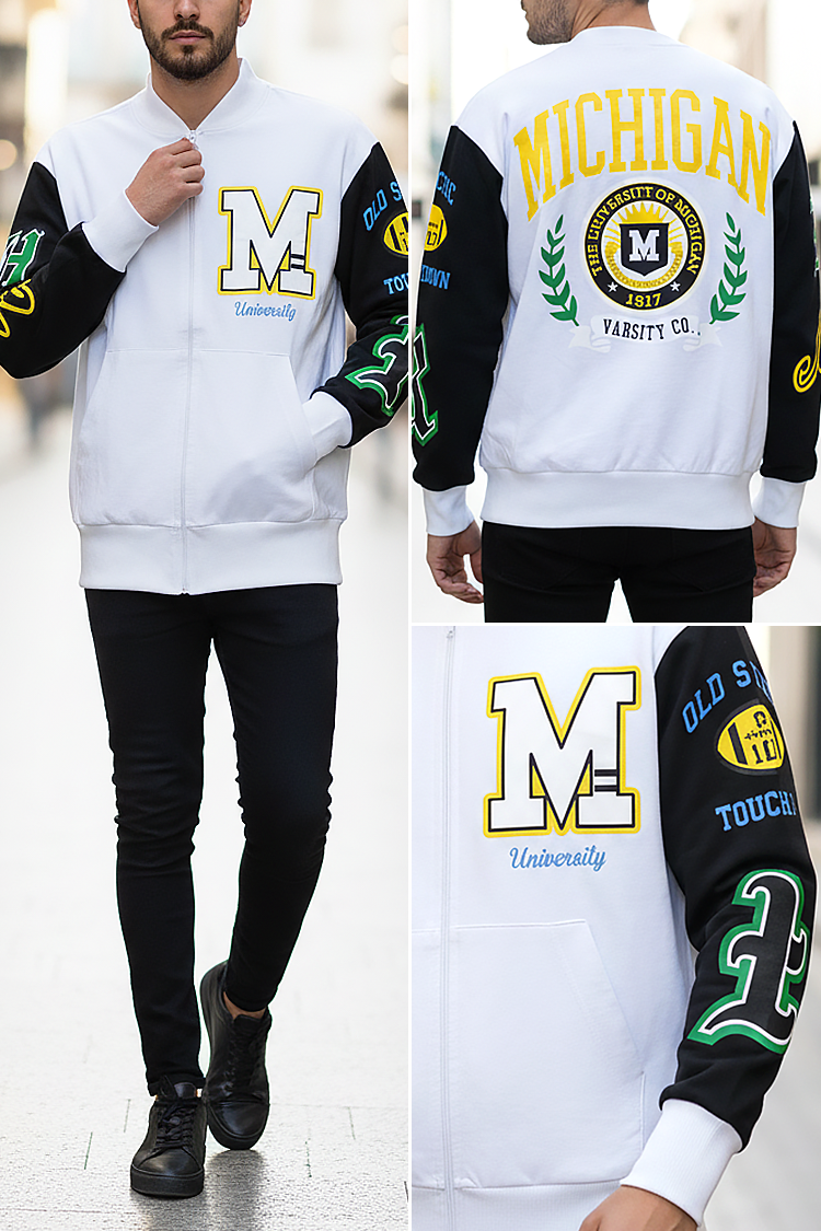 - Модерен мъжки суичър с джобове в бял цвят и ефектен принт на ръкавите и на гърба, подходящ за ежедневието, спорт или разходка.
