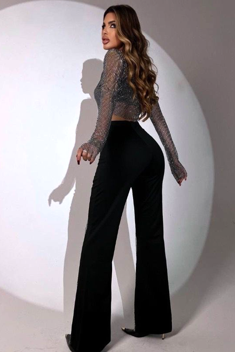 - Горната част е дъги ръкави и атрактивен мрежест дизайн, а панталонът е с дълга талия и секси кройка.