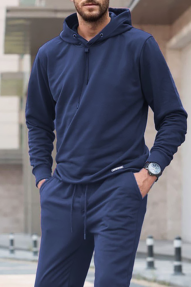 - Мъжки спортен комплект от две части, състоящ се от суичър с качулка и панталон в тъмносин цвят.