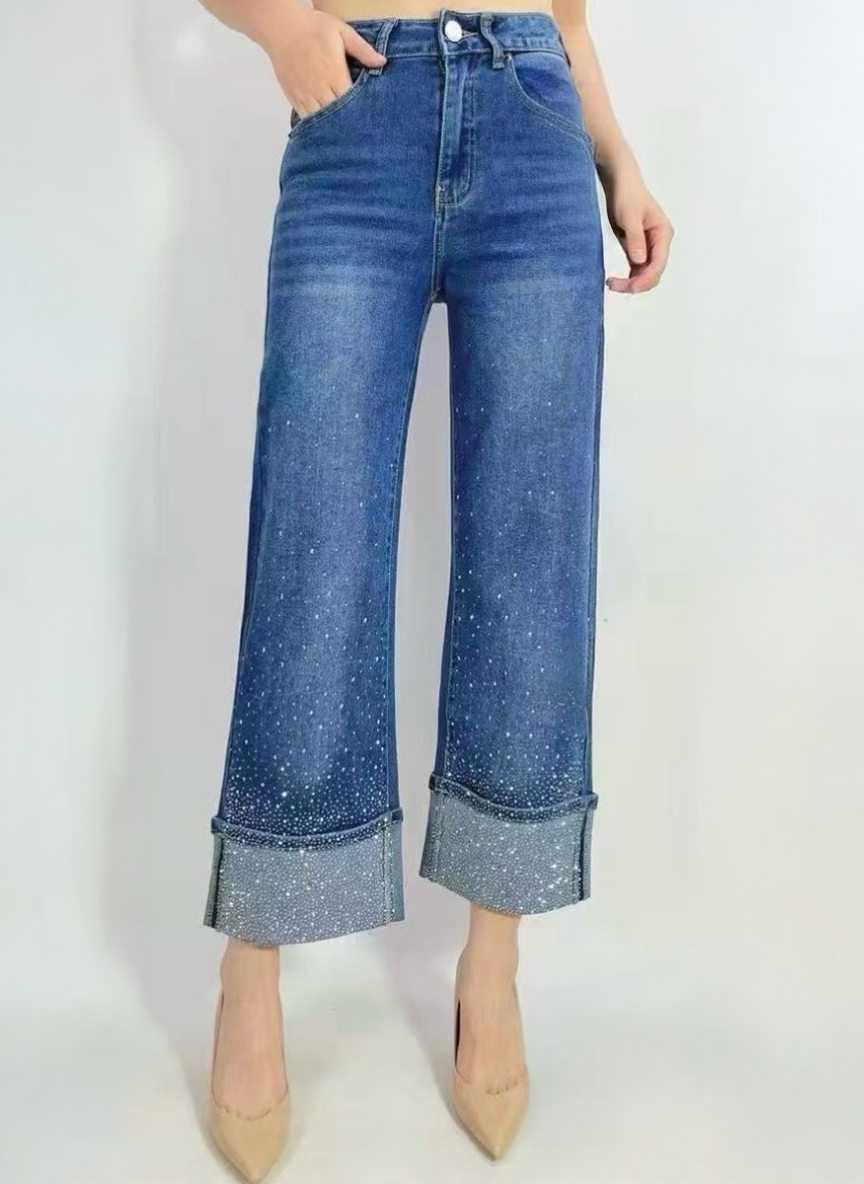 • Моделът е с висока талия, широки и подвити крачоли, и камъни.