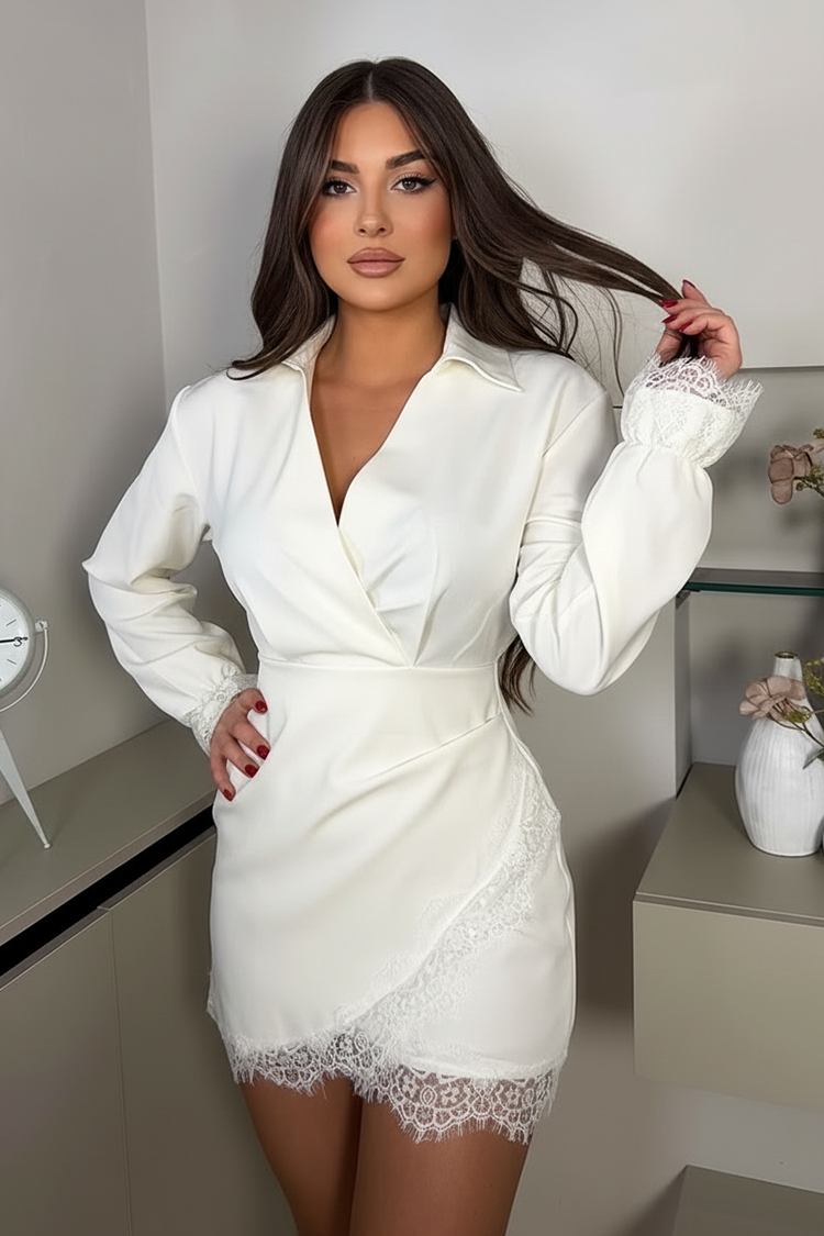 - Моделът е с дълги ръкави, вталена кройка и дантела в края на дължината.