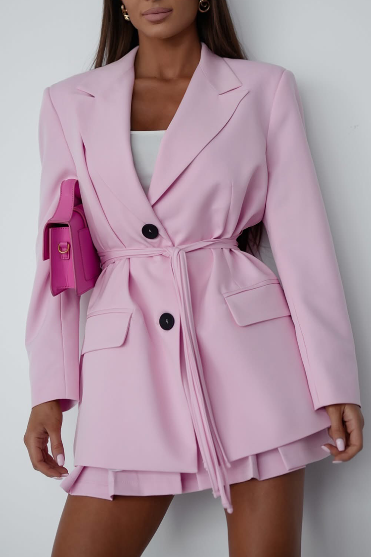 - Сакото е с класическа кройка, яка, копчета, странични джобове и колан от същата материя.