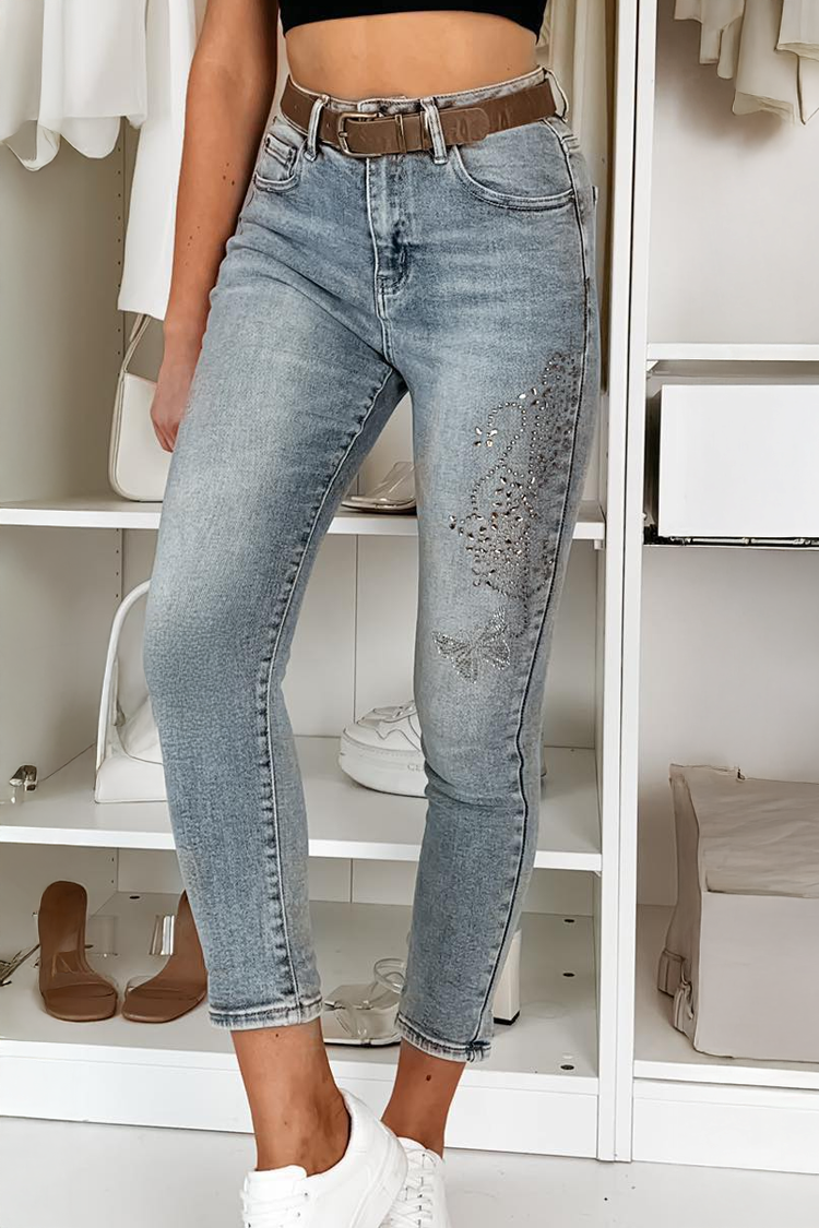 - Моделът е с висока талия, вталена кройка, странични джобове и блестящи детайли.
