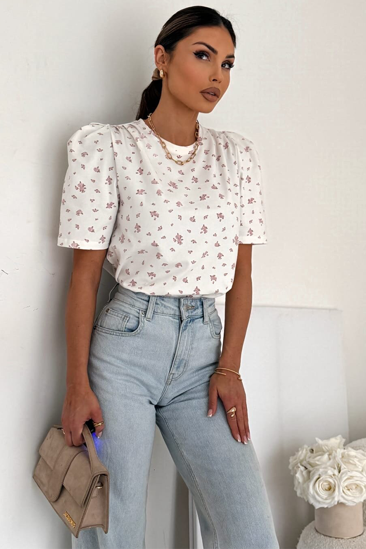 - Моделът е с къси и кокетни ръкави, обло деколте, прецизна кройка и флорален десен.