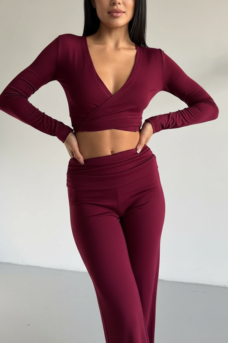 - Блузата е с къса дължина и V-образно деколте.