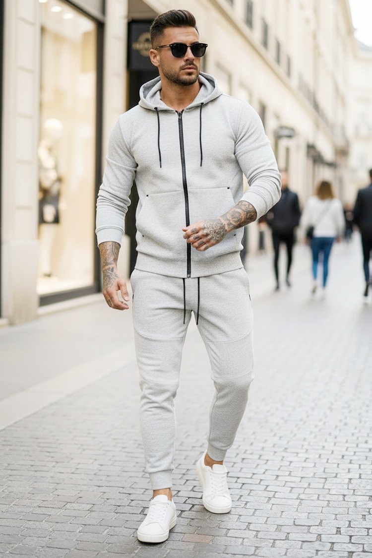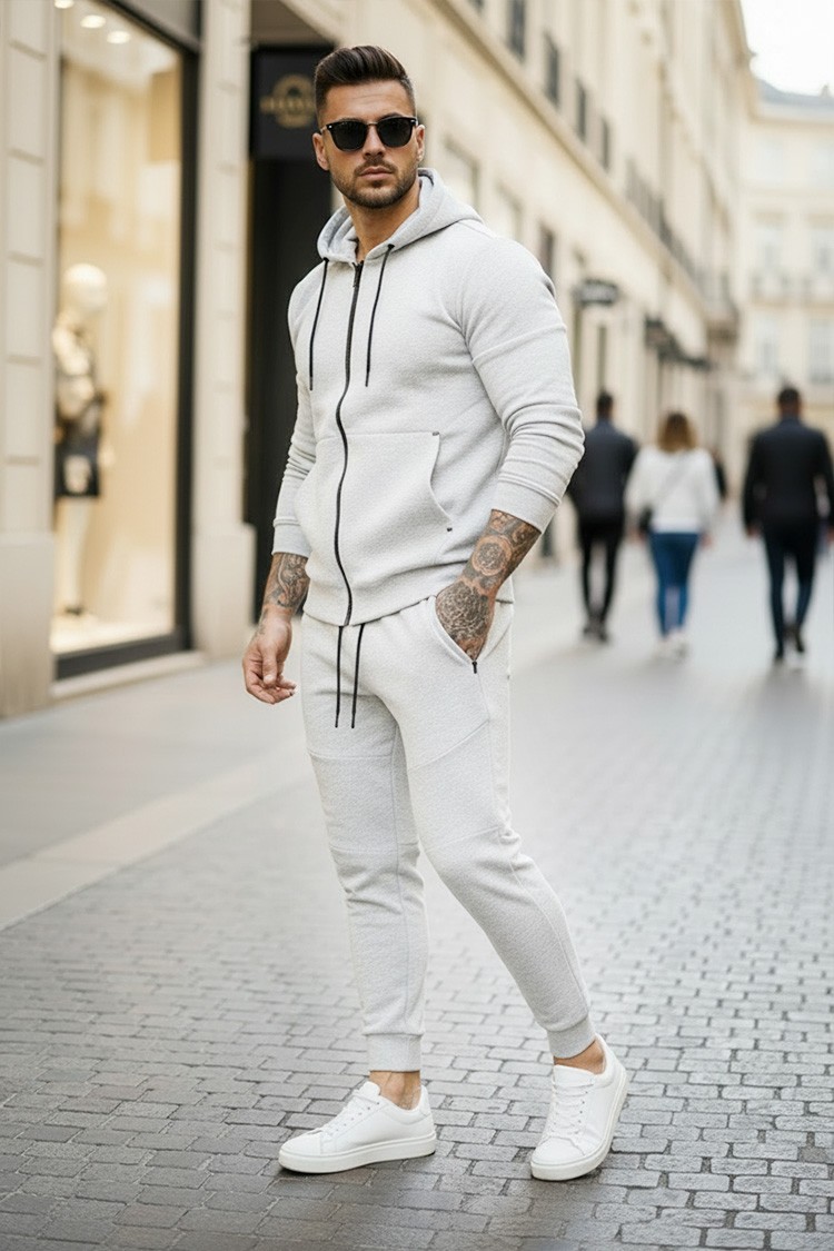 - Практичен мъжки комплект от две части, състоящ се от суичър с качулка и панталон в светлосив цвят.