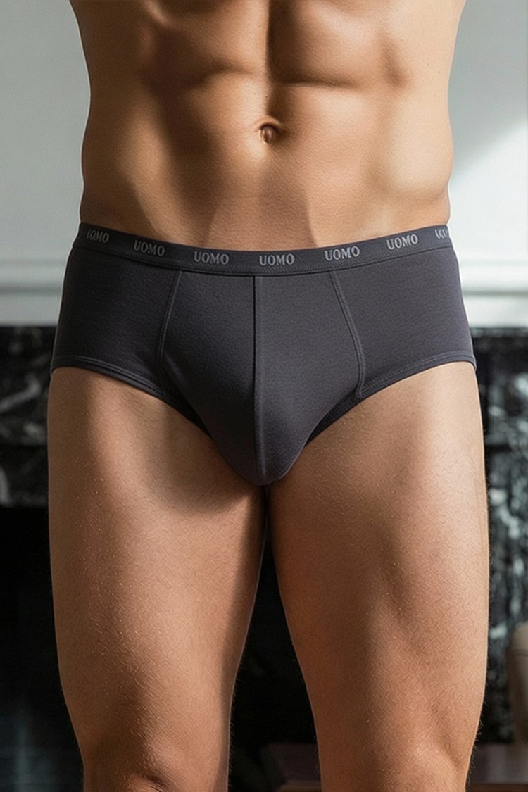 - Мъжки слип с едноцветен десен и ластик с надпис, изработен от памучна, дишаща материя.