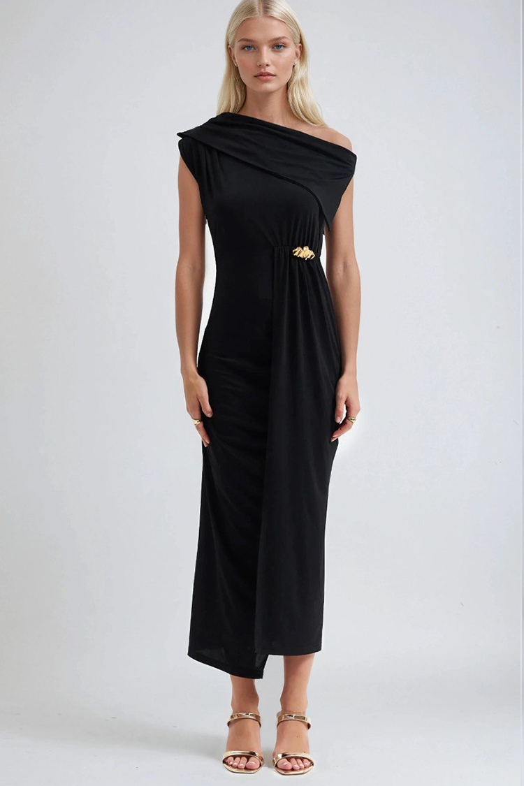 - Моделът е елегантна кройка, метален детайл отпред, цепка и асиметрично деколте.