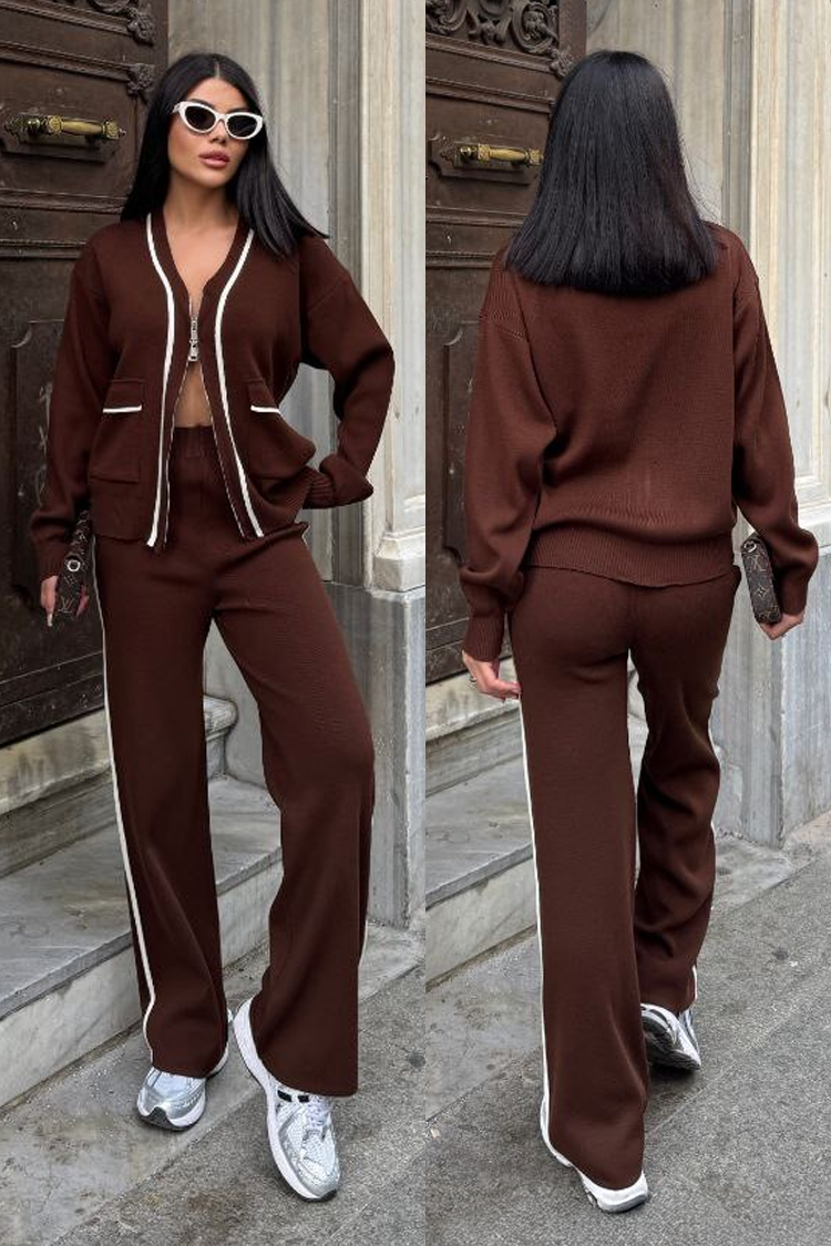 • Жилетката е с удобна кройка и закопчаване с ципове. Панталонът е с висока талия и дълги крачоли.