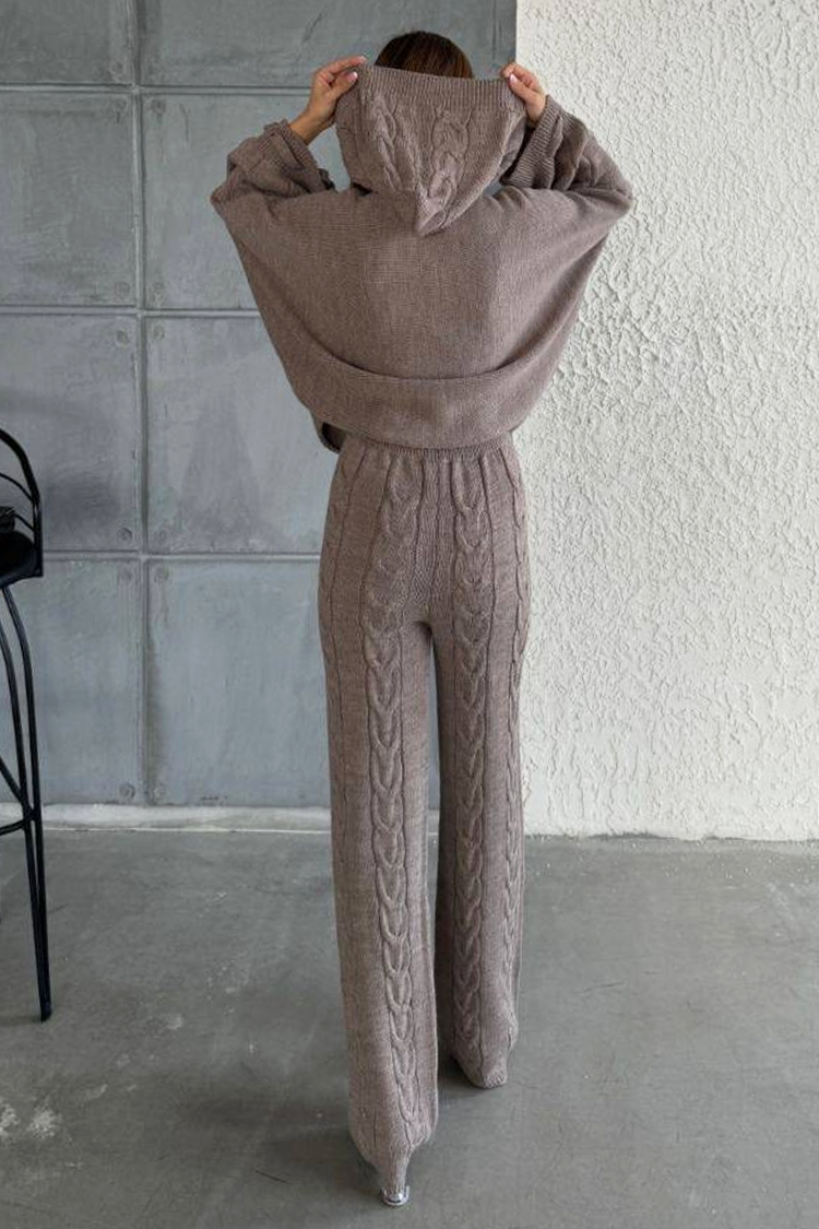 - Суичърът е със свободна кройка и качулка, а панталонът е с разкроен дизайн и висока талия.