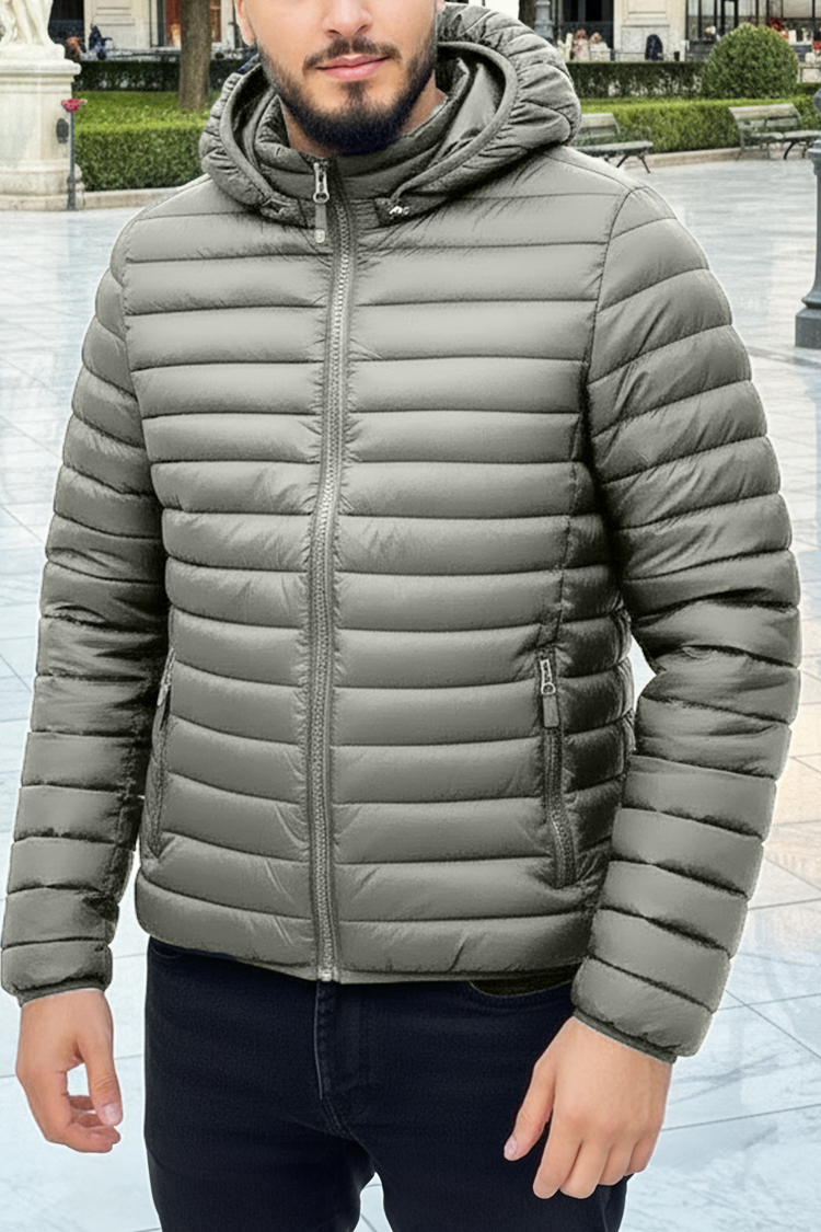 • Удобно мъжко яке с хоризонтален капитониран дизайн и сваляща се качулка в цвят каки със спортно-ежедневен стил.