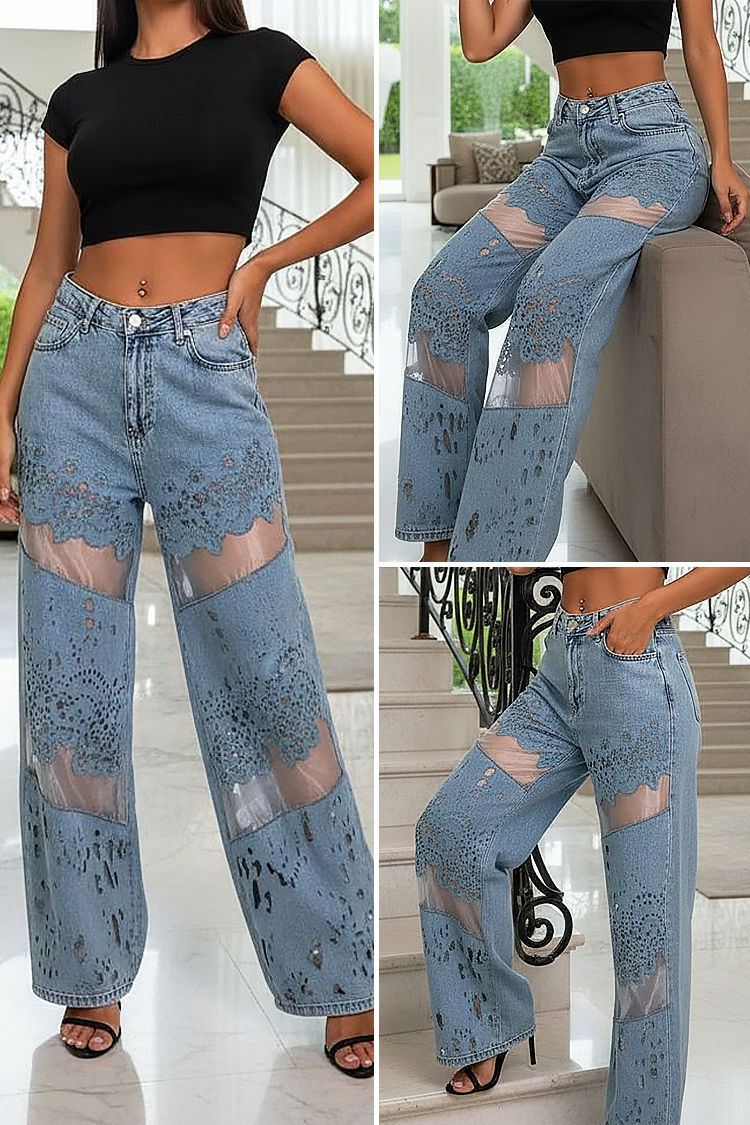 - Моделът е с висока талия, широки крачоли и ефектен дизайн с изрязани детайли.