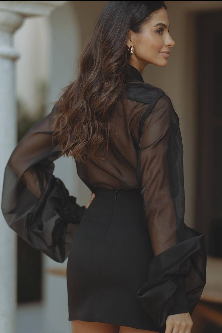 - Блузата е с дълги буфан ръкави, яка и прозрачна материя, а полата е с къса дължина и секси вталена кройка.