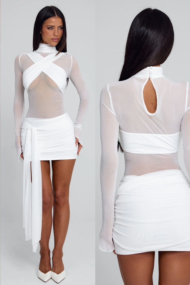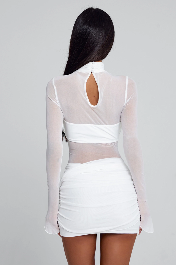 - Моделът е със секси и вталена кройка, дълги ръкави, бял цвят и прозрачни детайли.