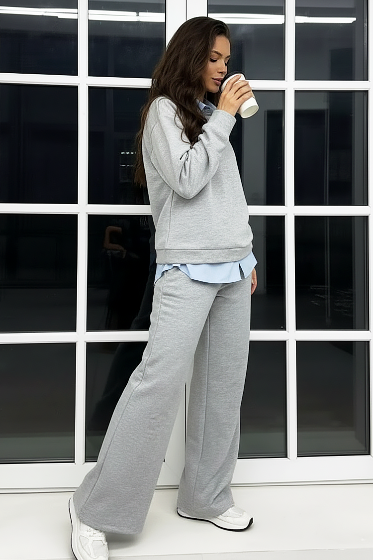 - Блузата е с ефектна кройка и комбинирана материя, а панталонът е с висока талия и комфортна кройка.