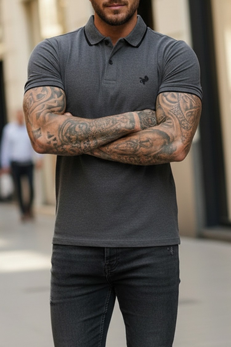 - Елегантен модел тениска с яка с копчета и изчистен дизайн, подходяща за различни поводи и модни съчетания.