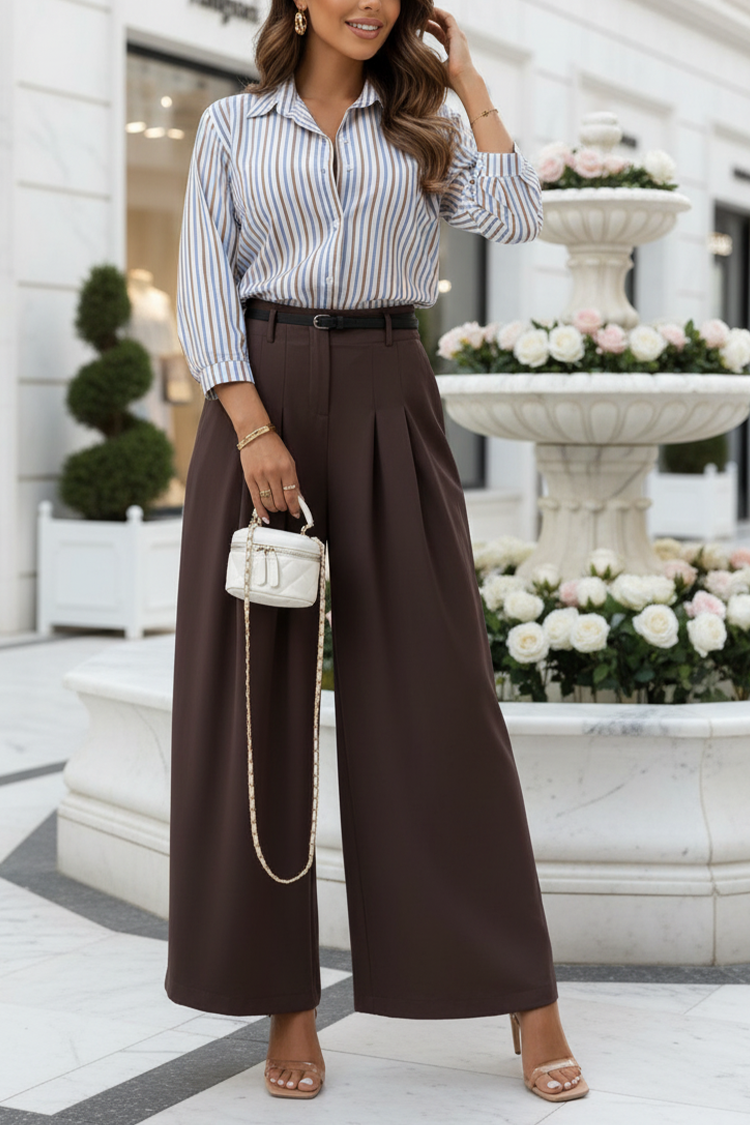 - Моделът е с висока талия, ефектен набор, свободна кройка и колан.