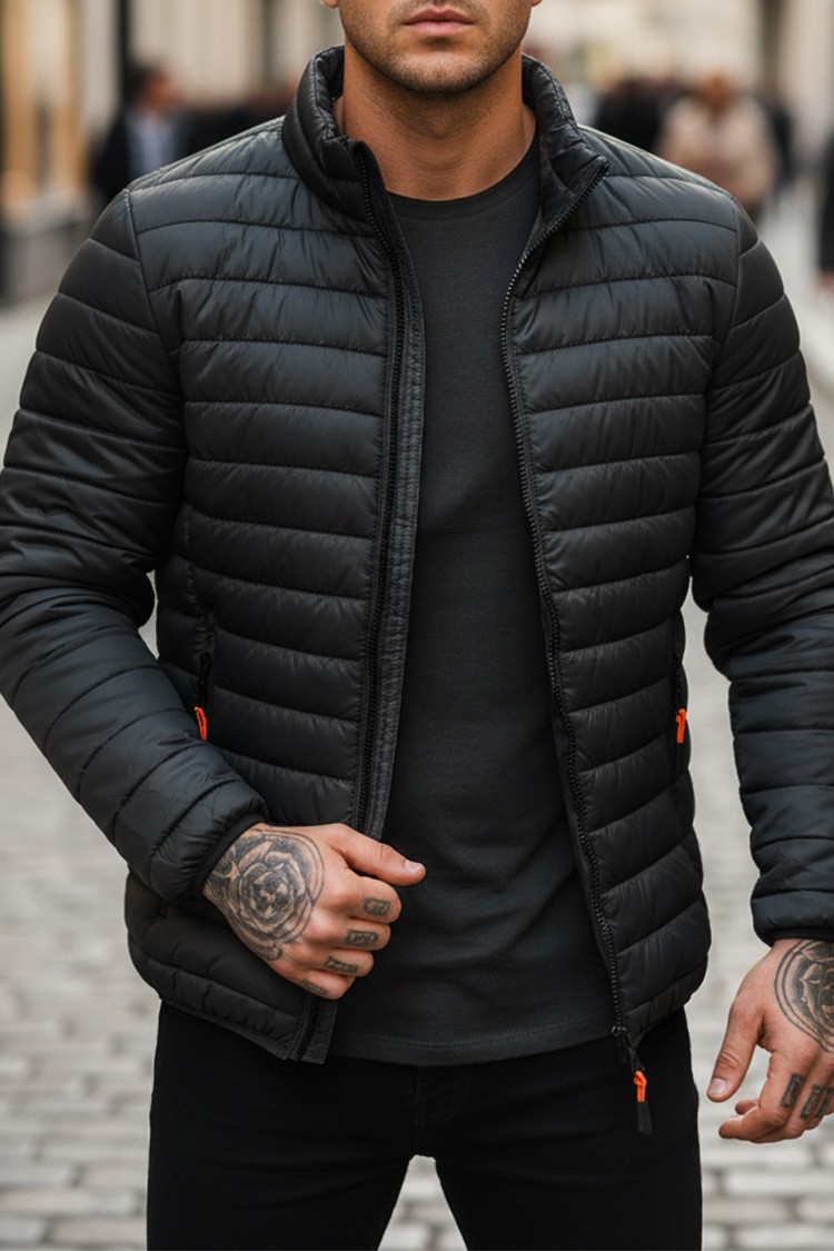• Капитониран модел мъжко яке със семпъл дизайн в черен цвят, подходящо за преходните сезони.
