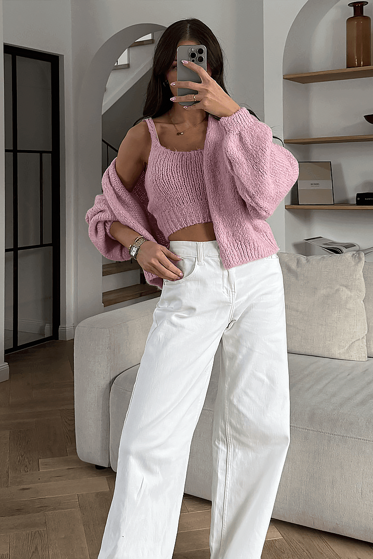 - Топът е с втален дизайн и кроп дължина, а жилетката е с дълги ръкави и класическа кройка.