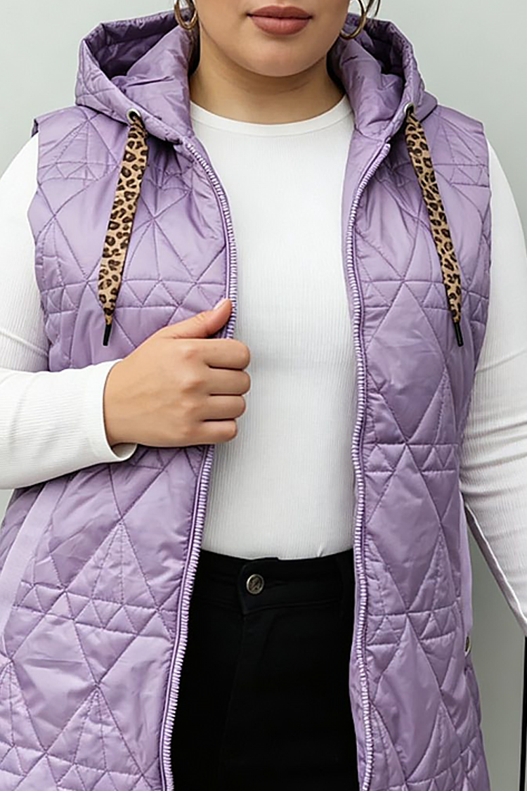 • Елекът е с макси кройка, капитониран дизайн и качулка с връзки.