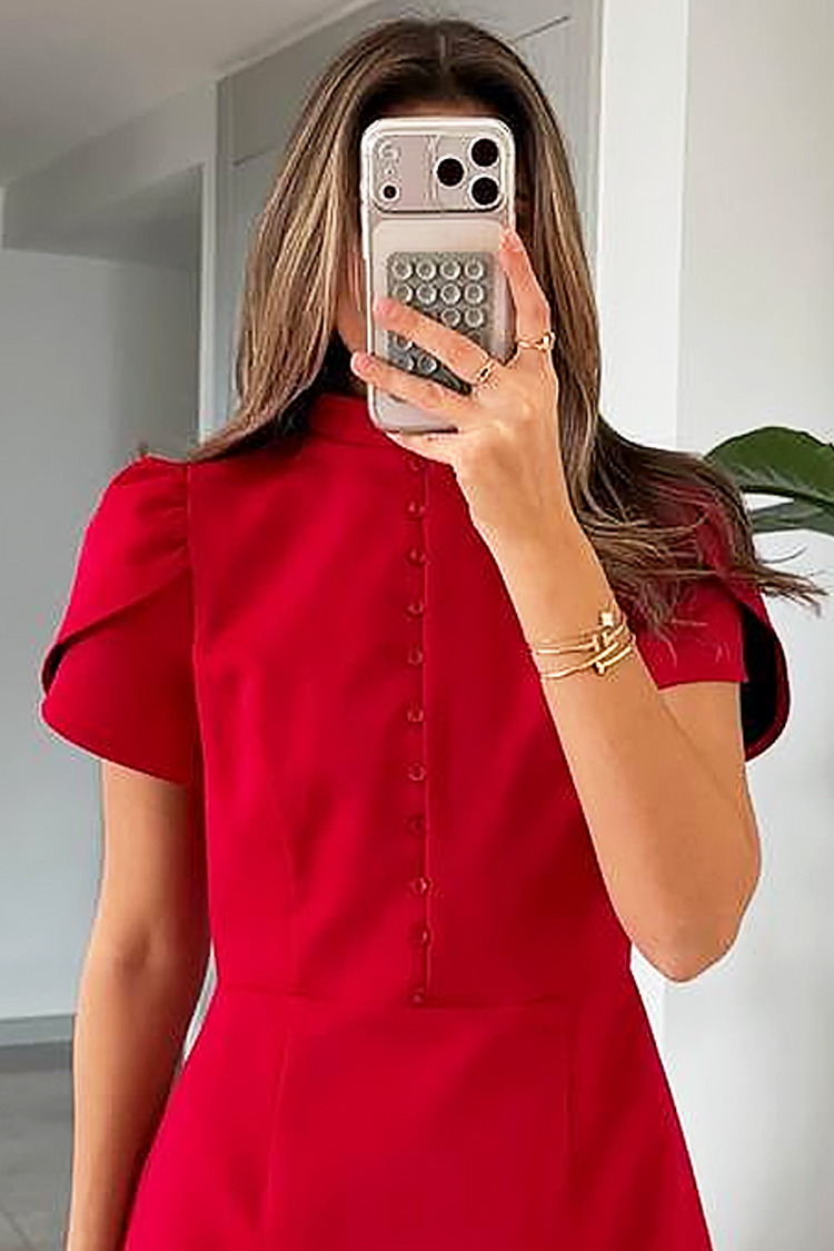 - Моделът е елегантна кройка, копчета, яка и къси буфан ръкави.