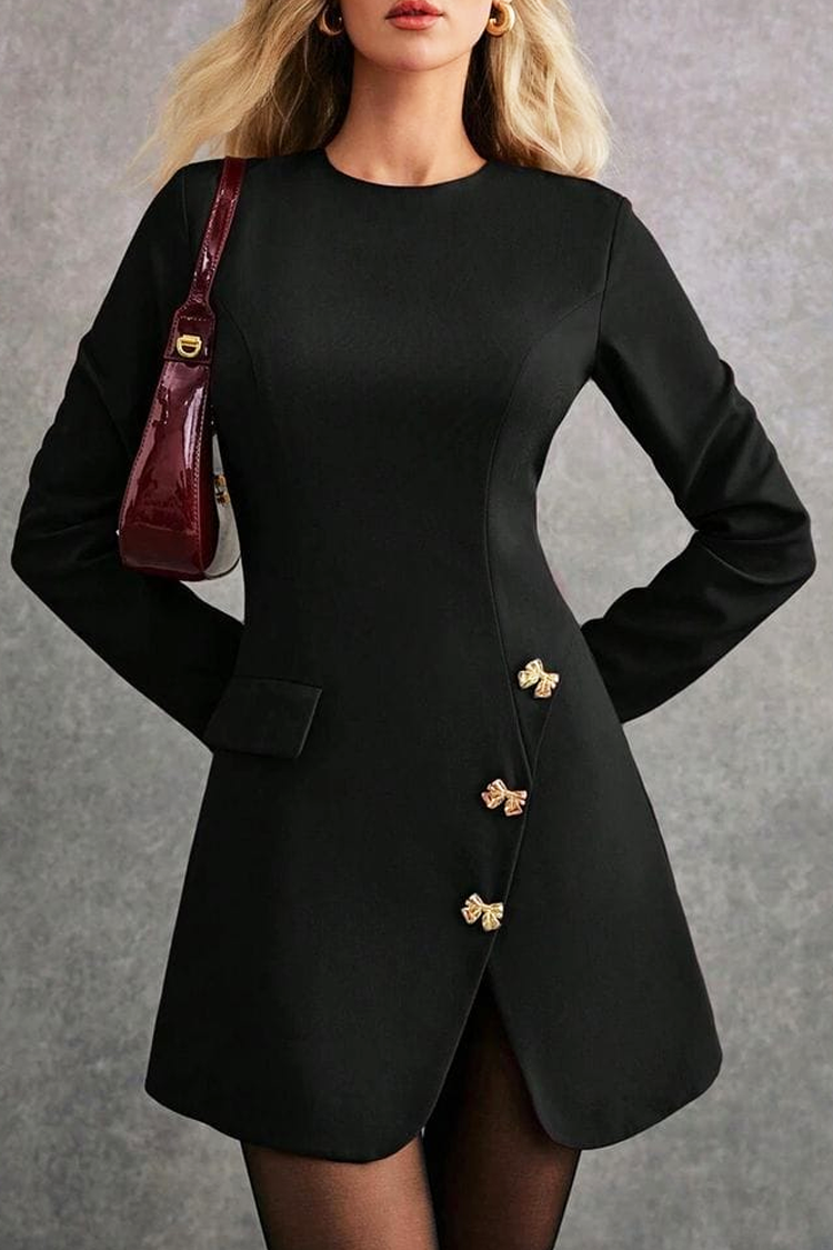 • Роклята е с дълги ръкави, елегантна кройка, втален дизайн и черен цвят.
