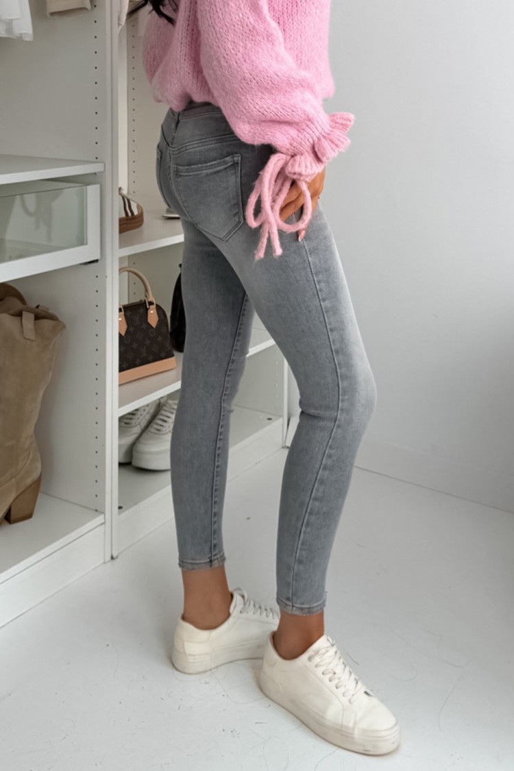- Моделът е с висока талия, джобове, кройка по тялото и модерен изтрит ефект.