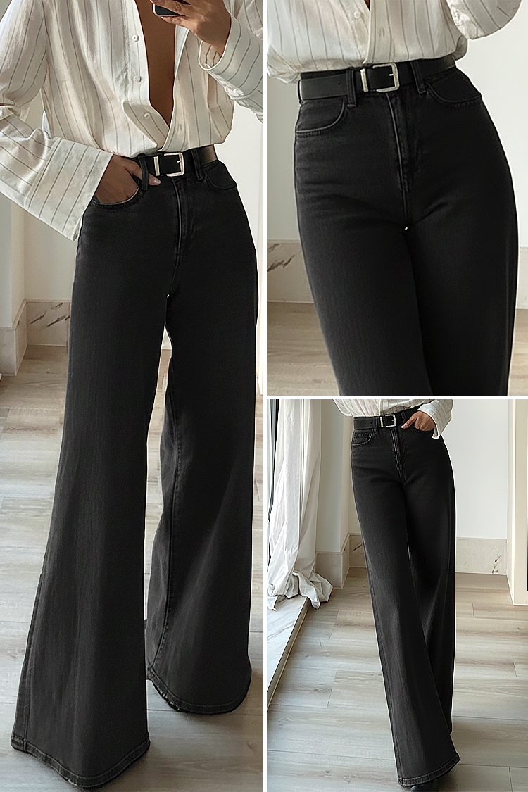 - Моделът е с висока талия и разкроен крачол, черен цвят и атрактивен колан.
