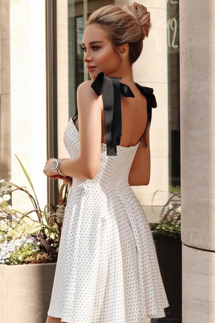 - Роклята е с къса дължина, десен на точки, ефектни, черни презрамки и бял цвят.