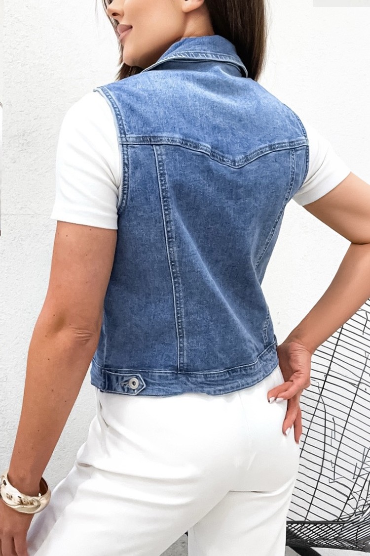 - Модерен дамски елек от деним в син цвят с избелен ефект, подходящ за различни модни съчетания.