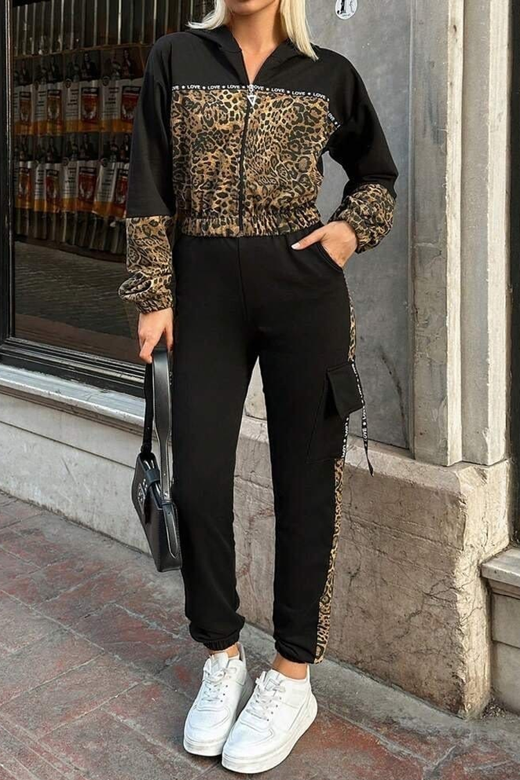 - Суичърът е със свободна кройка и качулка, а панталонът - с висока талия и ластик в края на крачолите.
